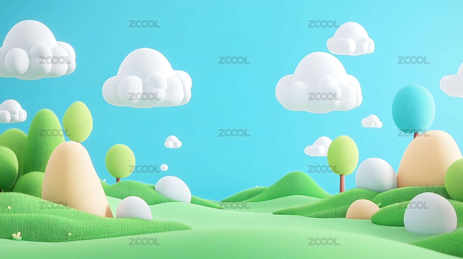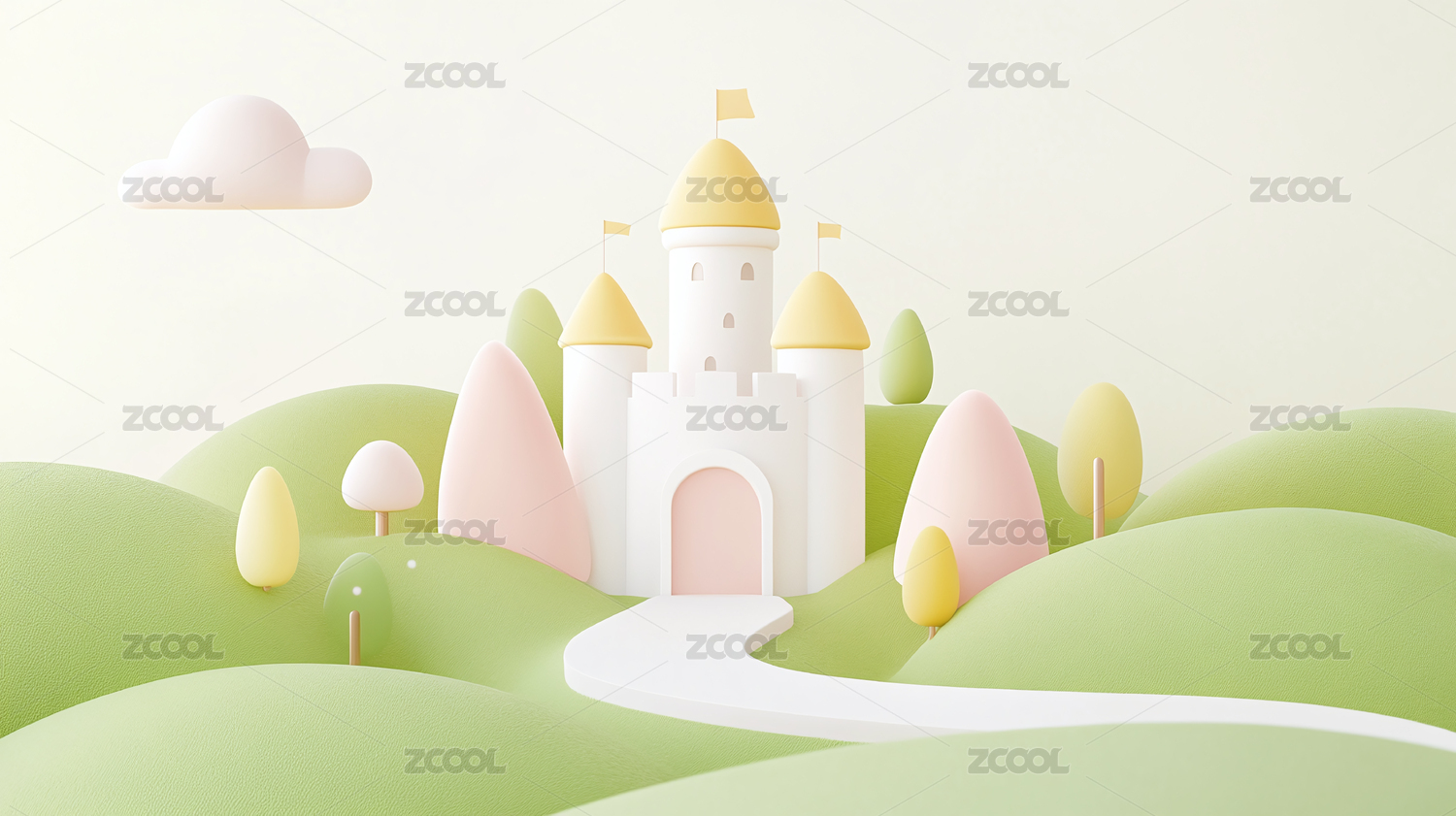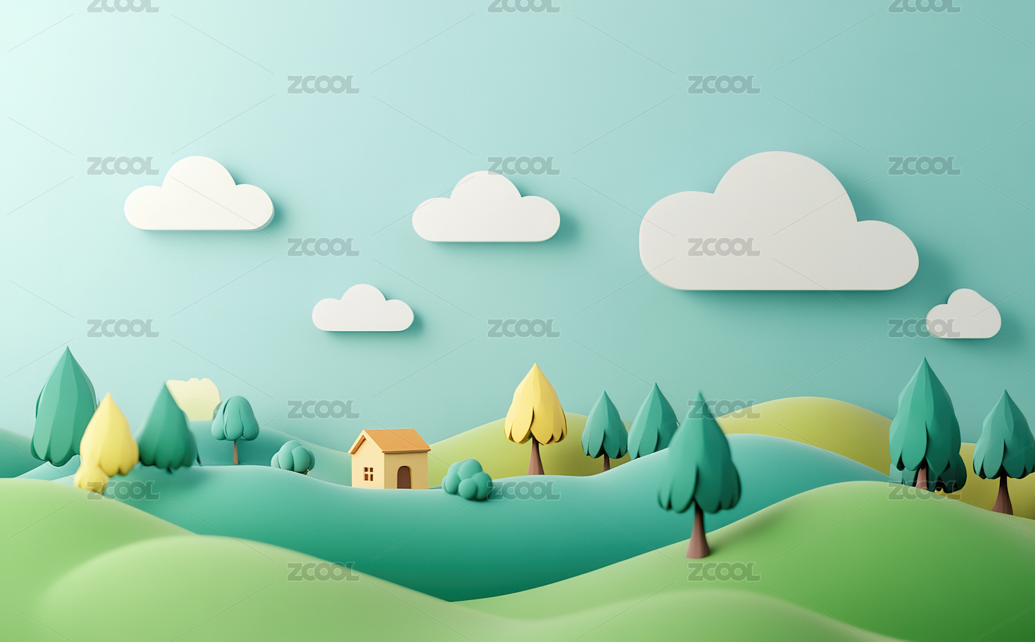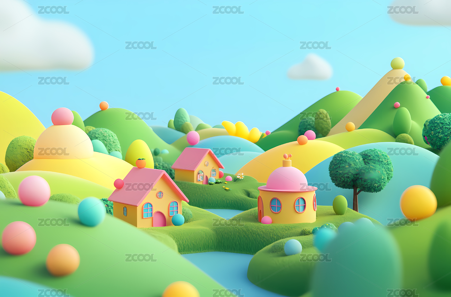 三维立体,3D,插画,背景,壁纸,儿童,童话,房屋,树木,蓝天