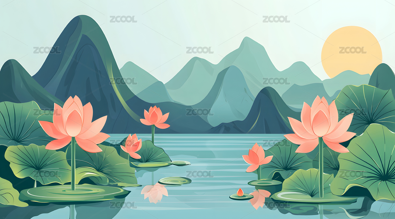 荷花,插画,背景,大暑,中式,简约,荷叶,湖泊,宁静,山峰
