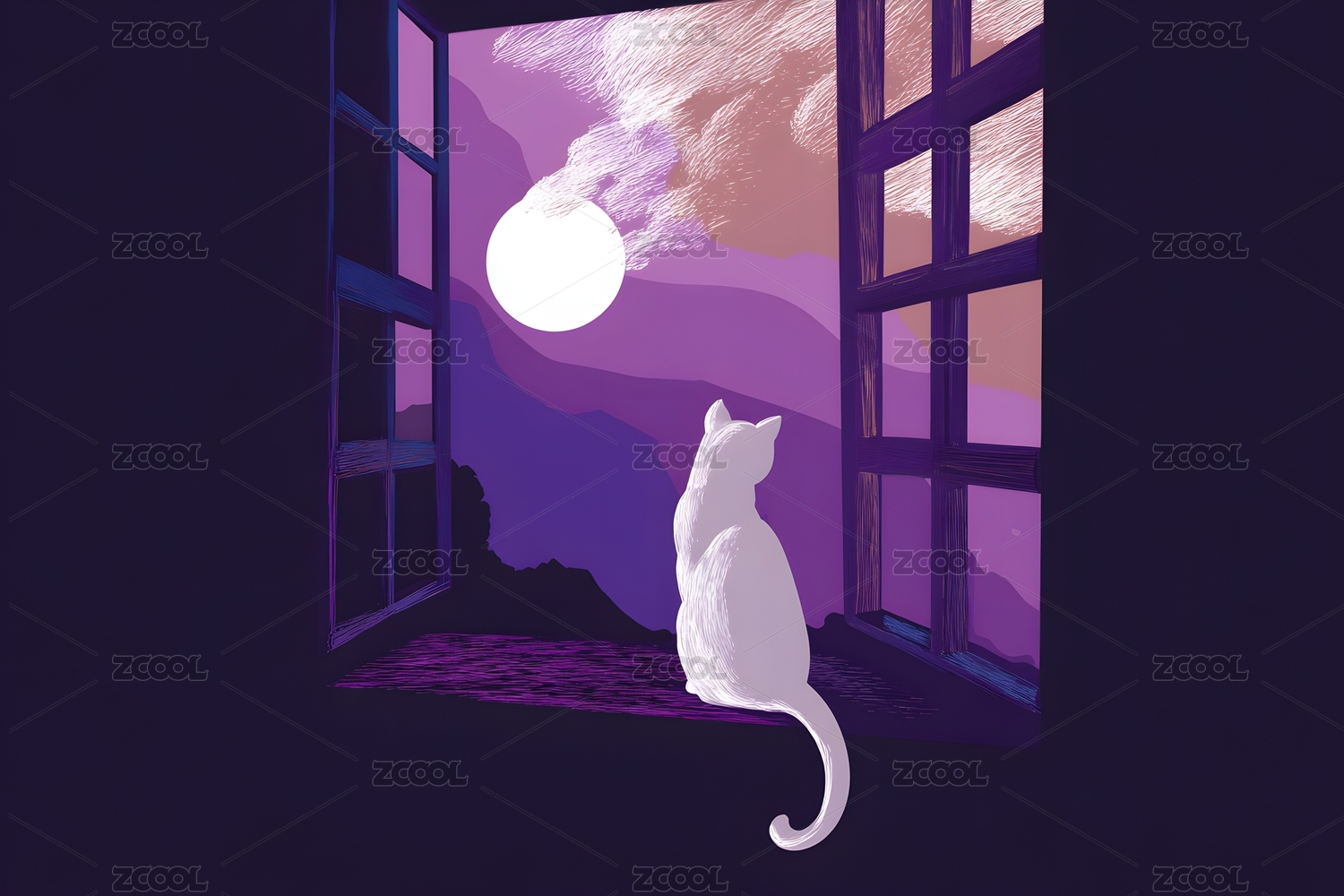 小猫咪坐在窗台上望着月亮插画