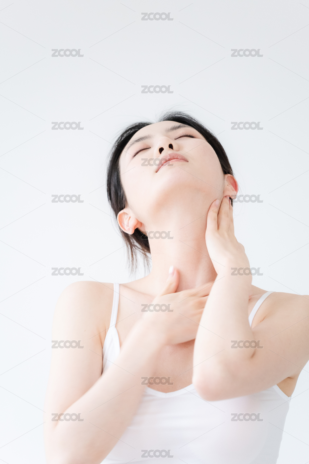 单手抚摸颈部的年轻女性