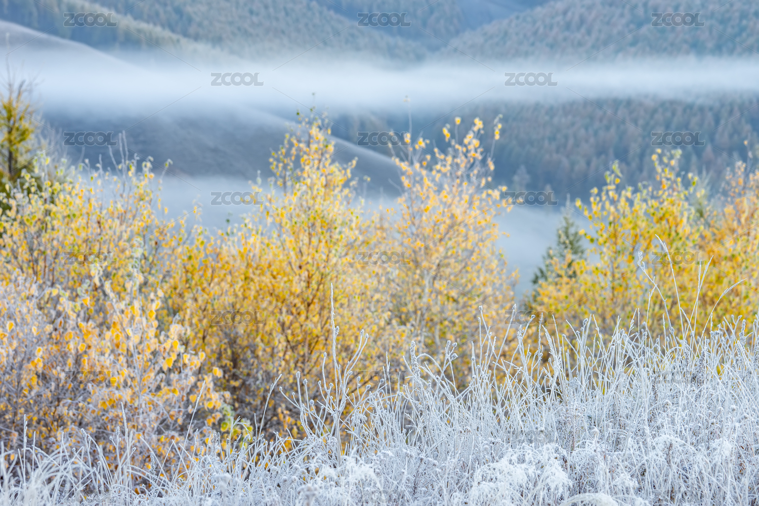 中国内蒙古阿尔山市山区深秋早起云雾雾凇