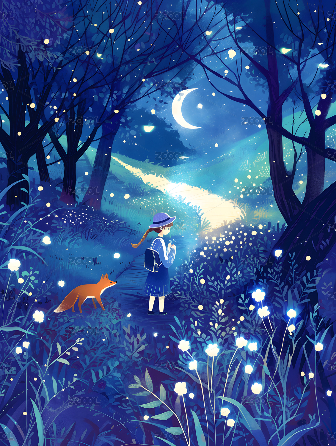 Q版,钓鱼,小女孩,狗狗,幽静,儿童插画