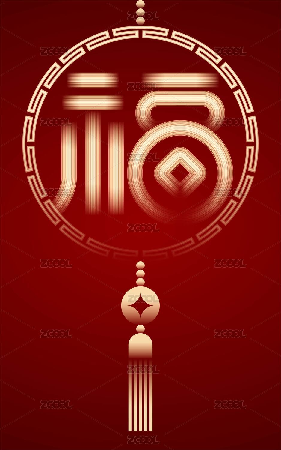 手写手绘汉字福字中国结艺术字门贴矢量插画
