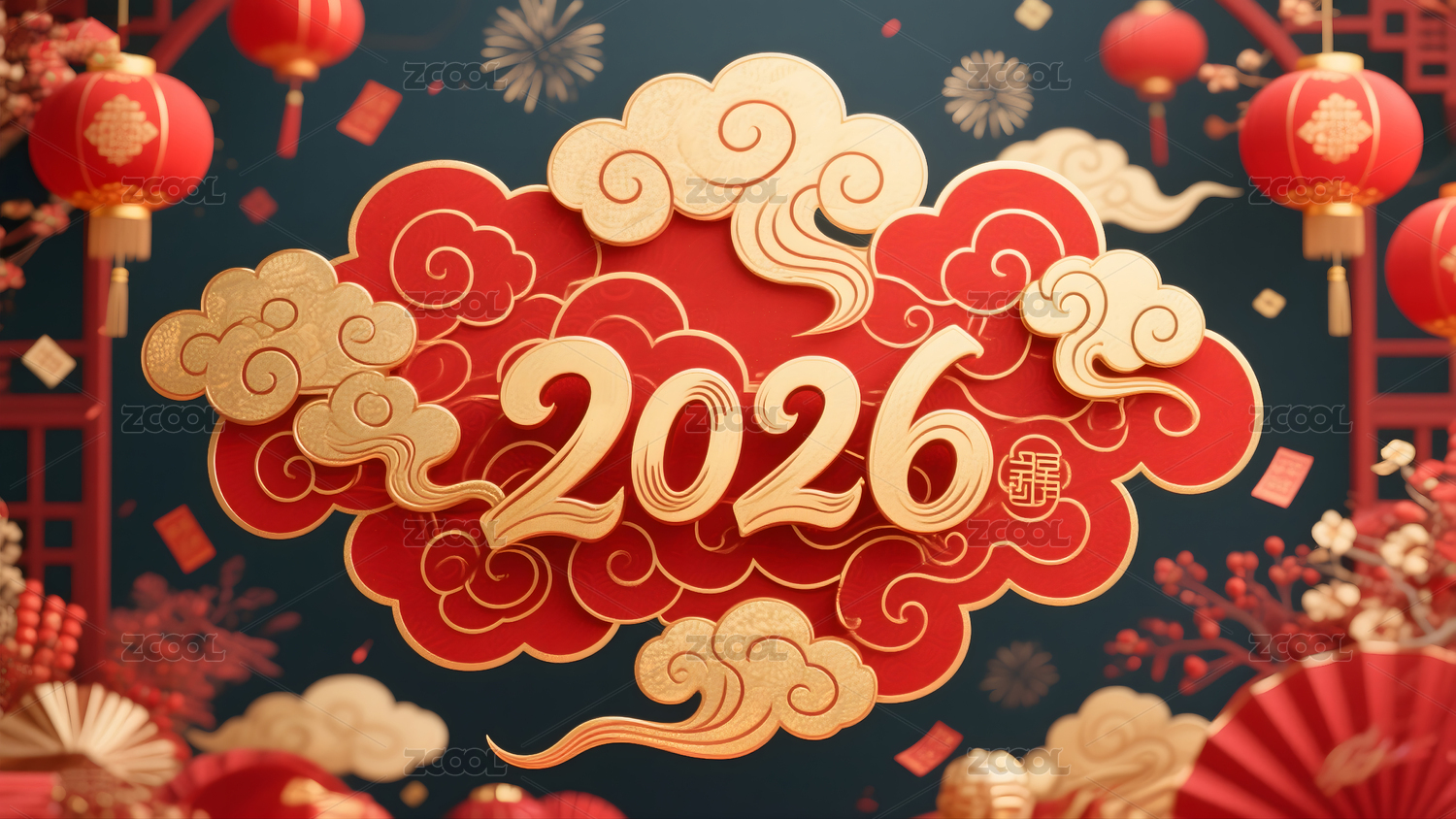 在红色云纹背景上的金色2026数字