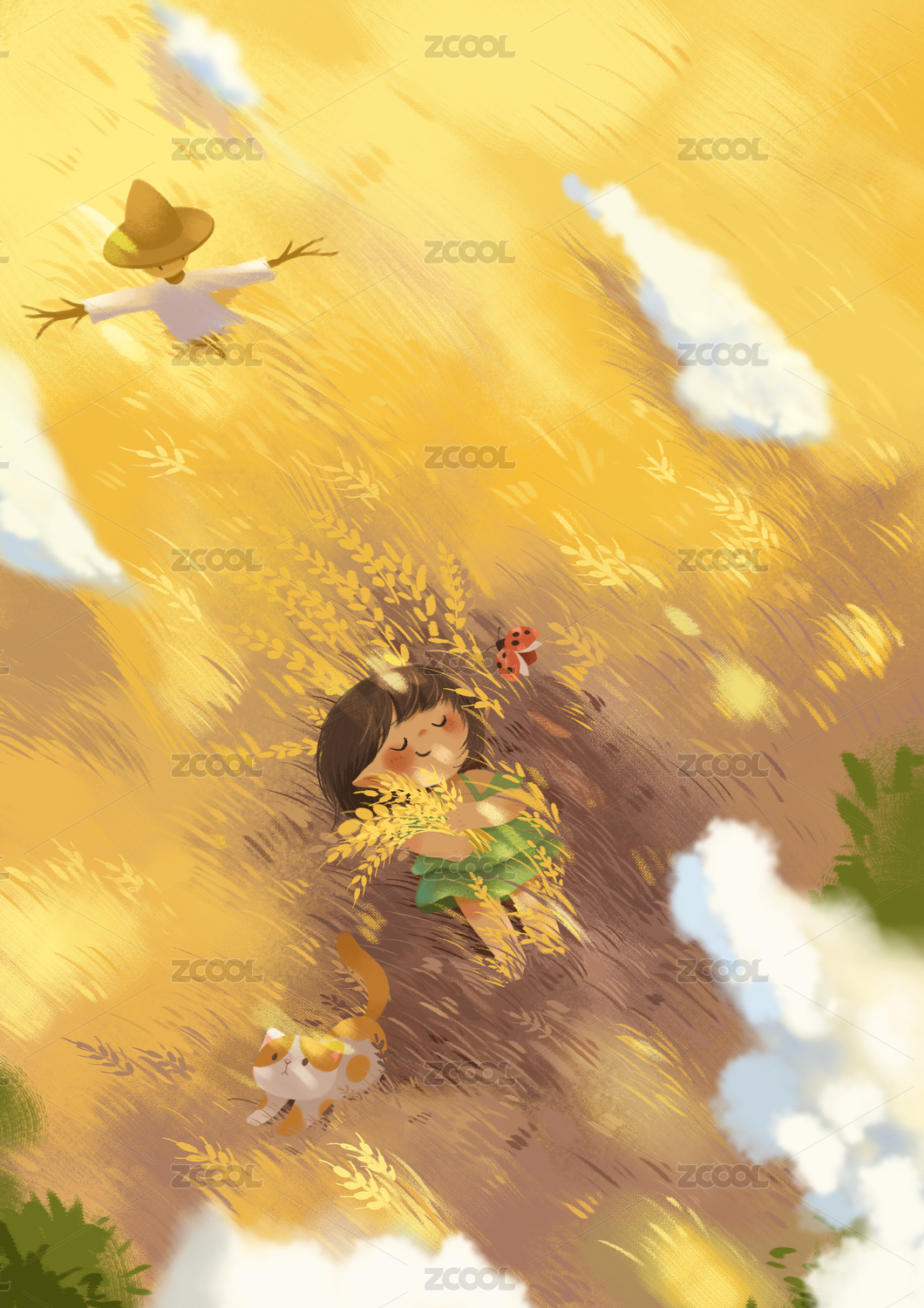 美好的春日里小女孩在山坡上吹泡泡 版绘