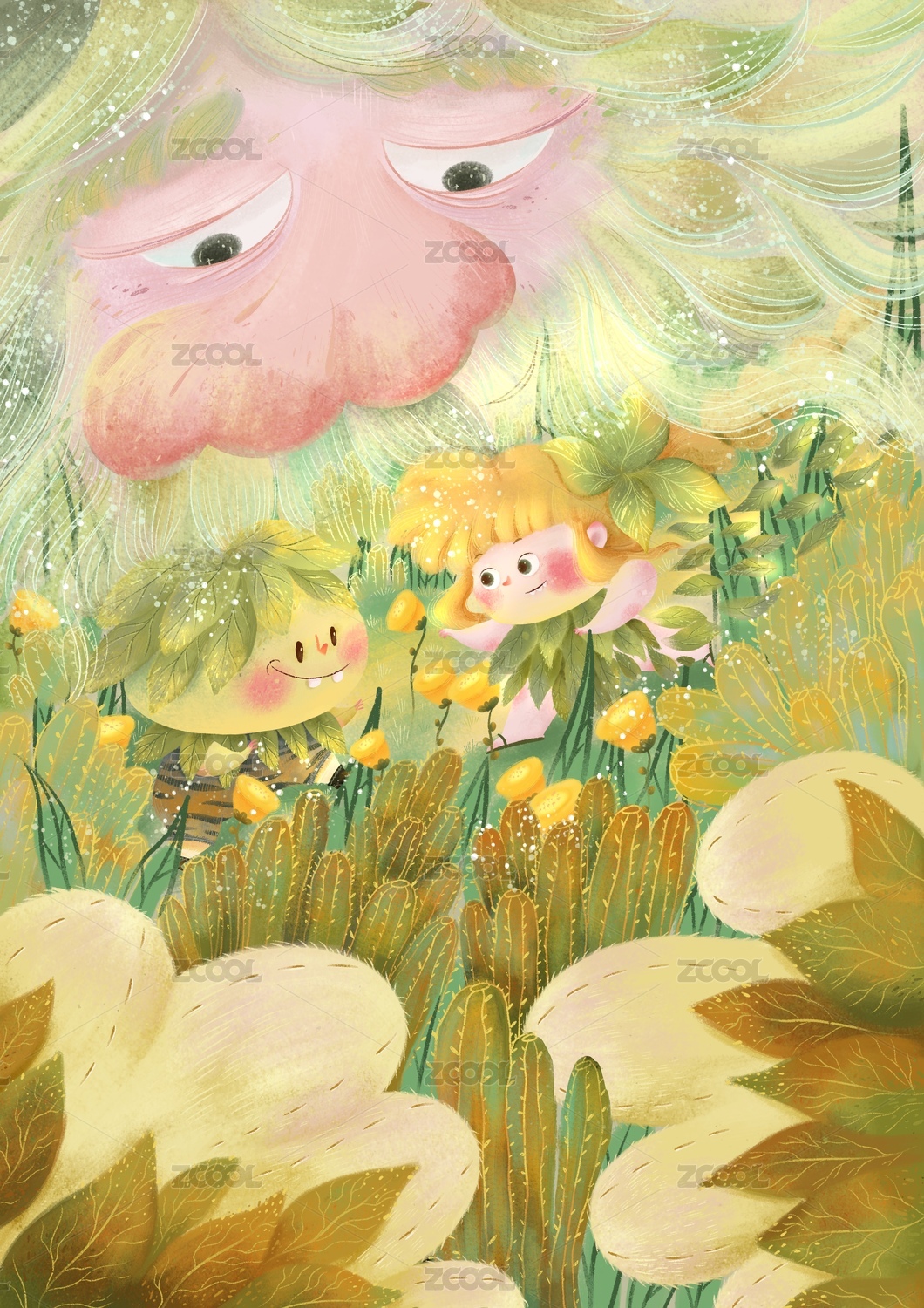 蘑菇森林里的蘑菇精灵在草地是玩耍,儿插