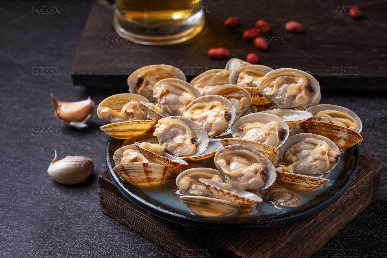黑底上放着一盘酱爆花甲