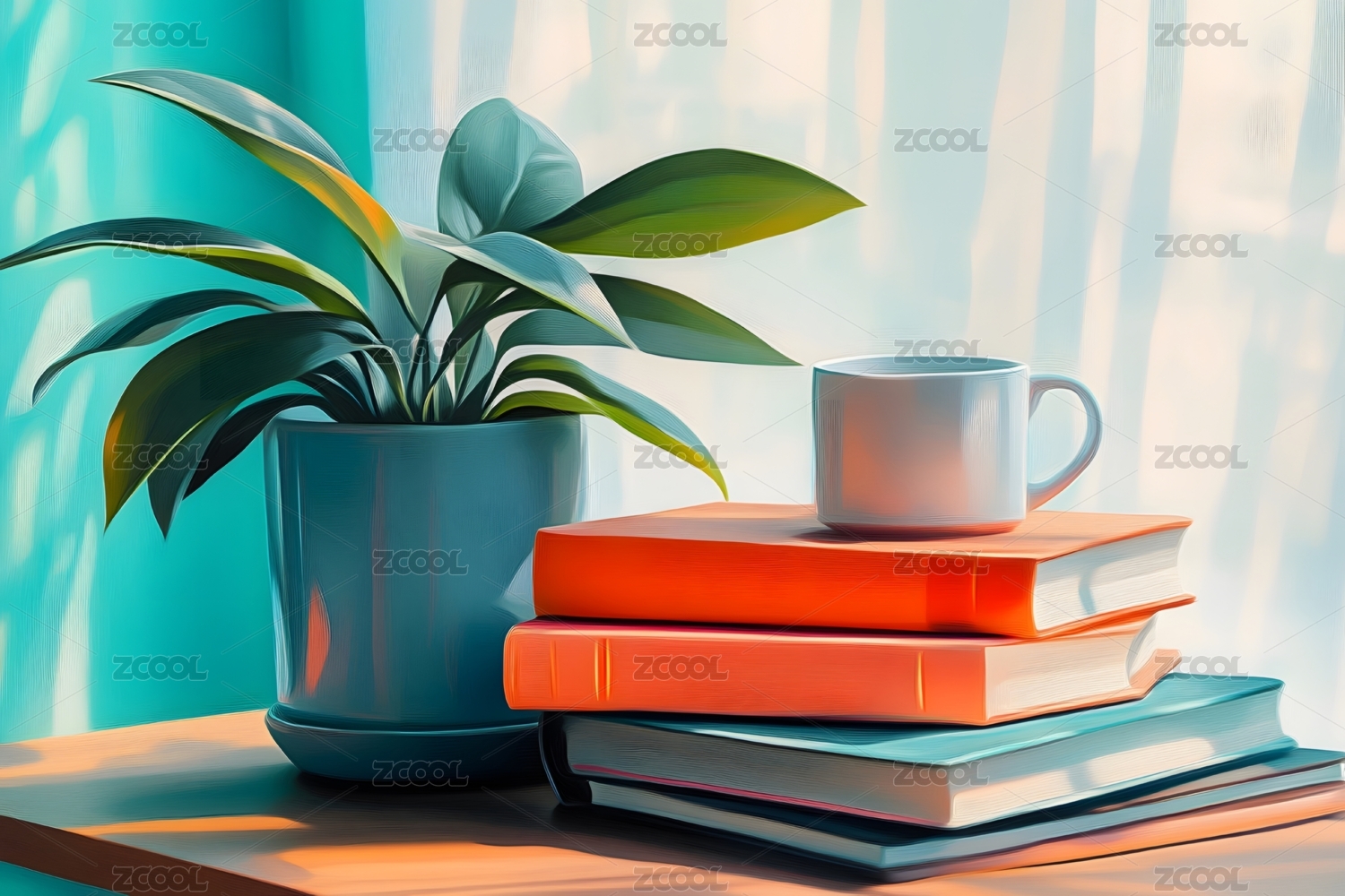 摆放在书桌上的咖啡和书以及绿植