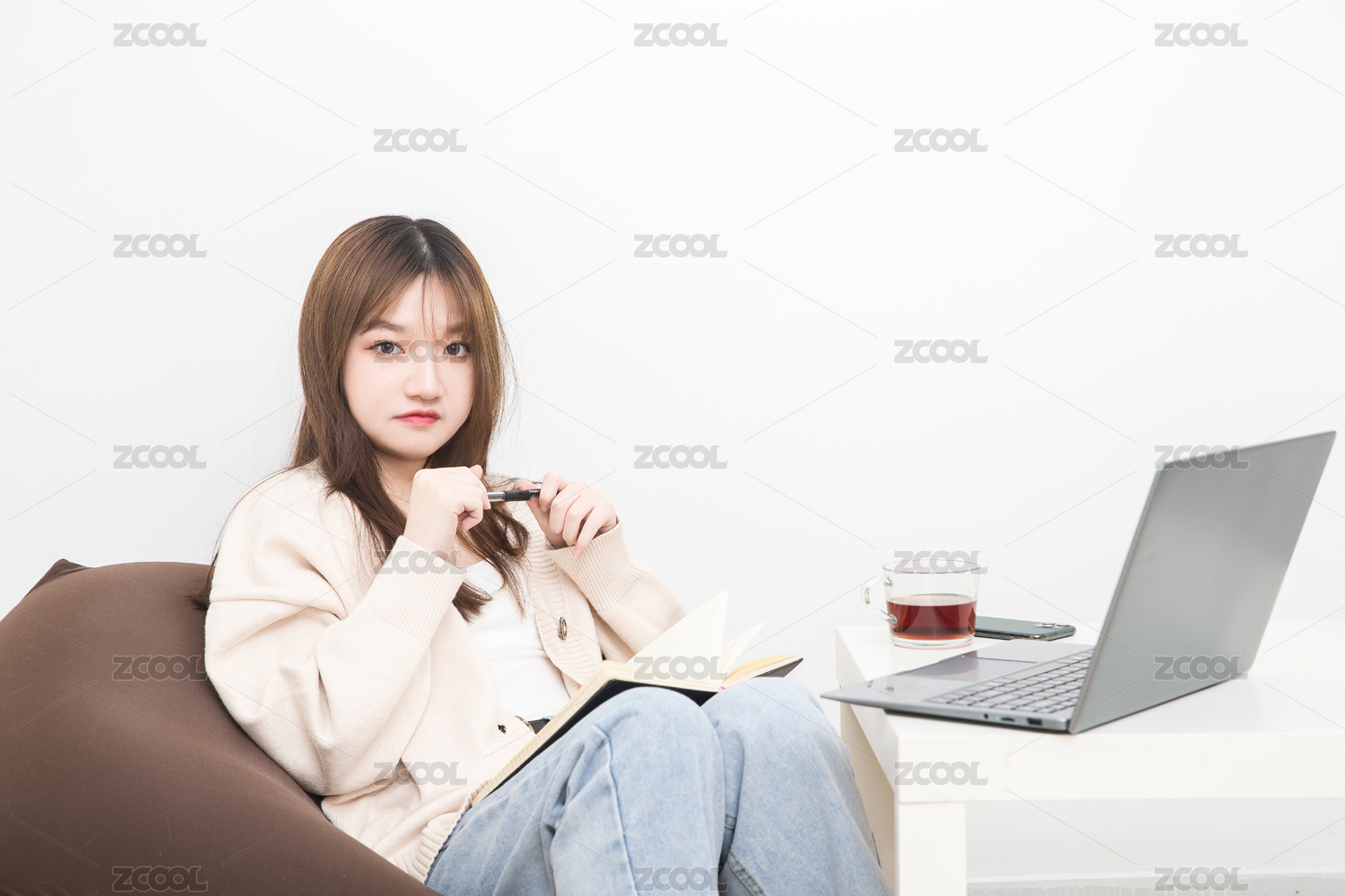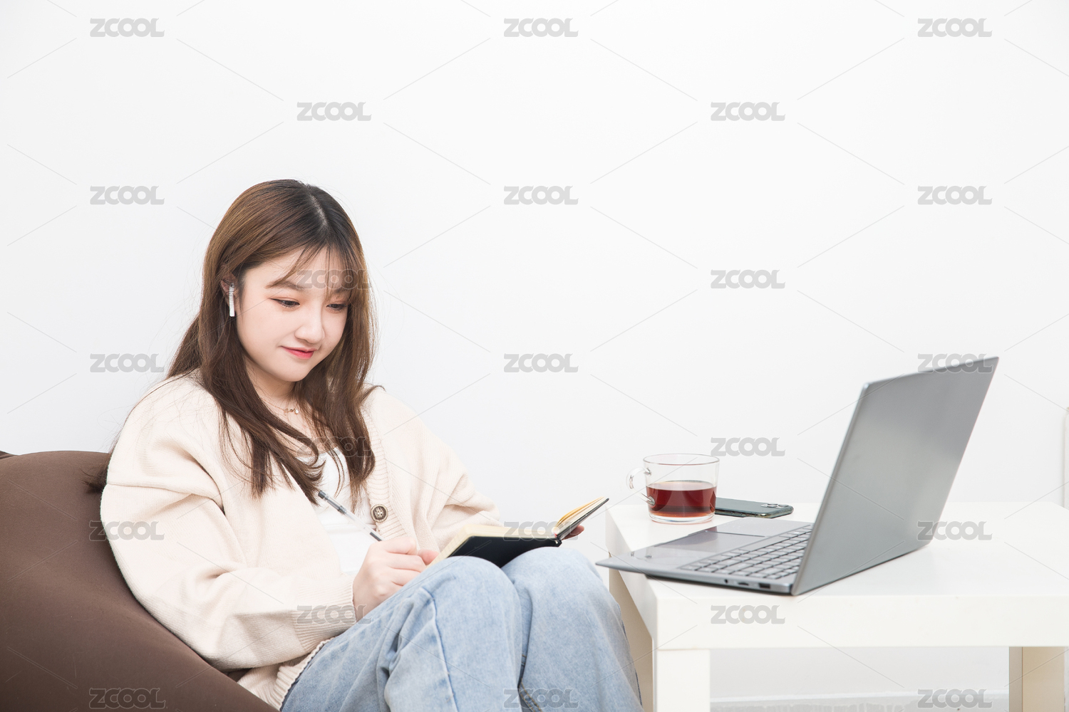 女孩,青少年,肖像,因特网,坐,漂亮的,沙发,在室内,茶,人