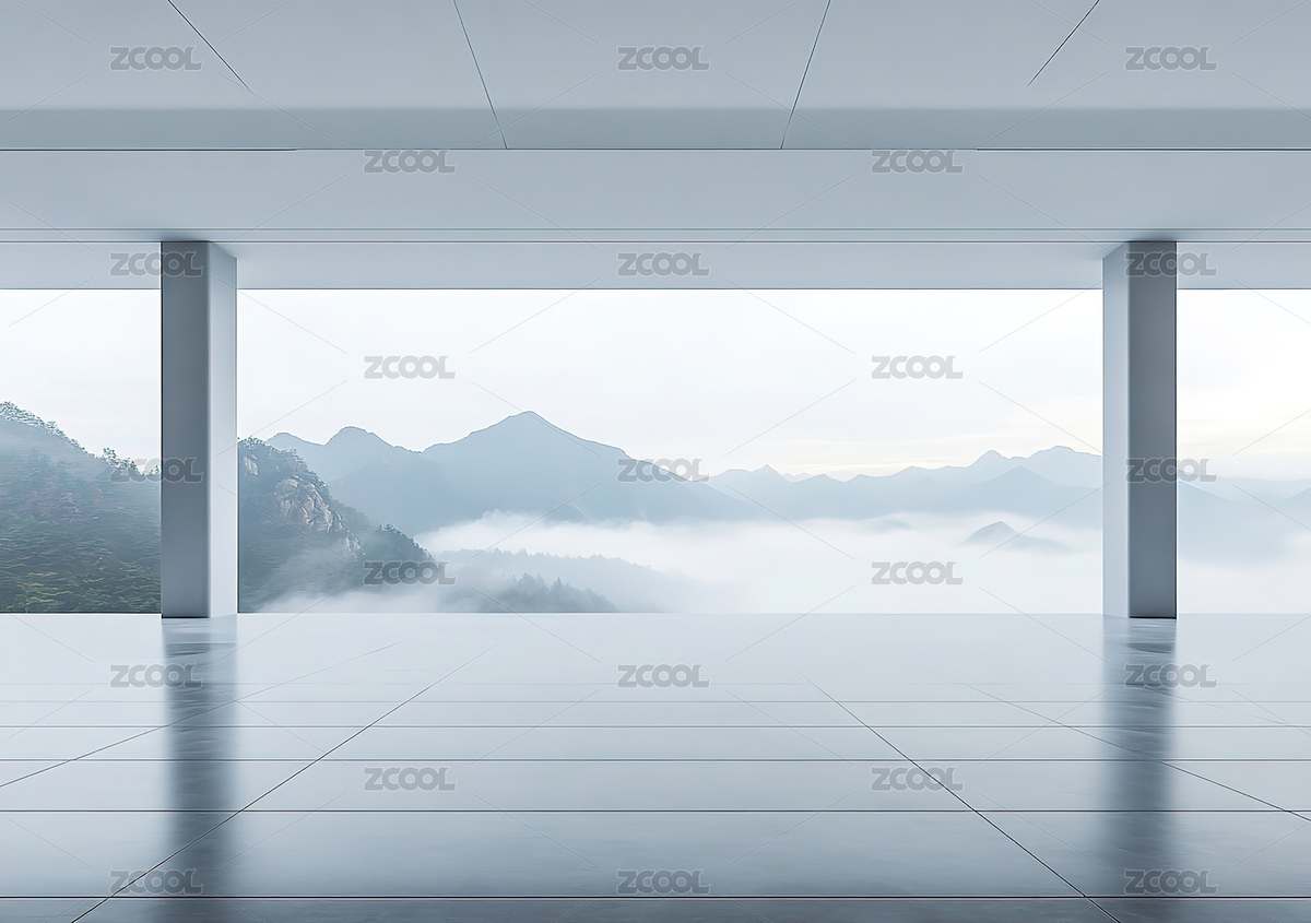 落地窗建筑内部大理石展厅带办公桌沙发窗外