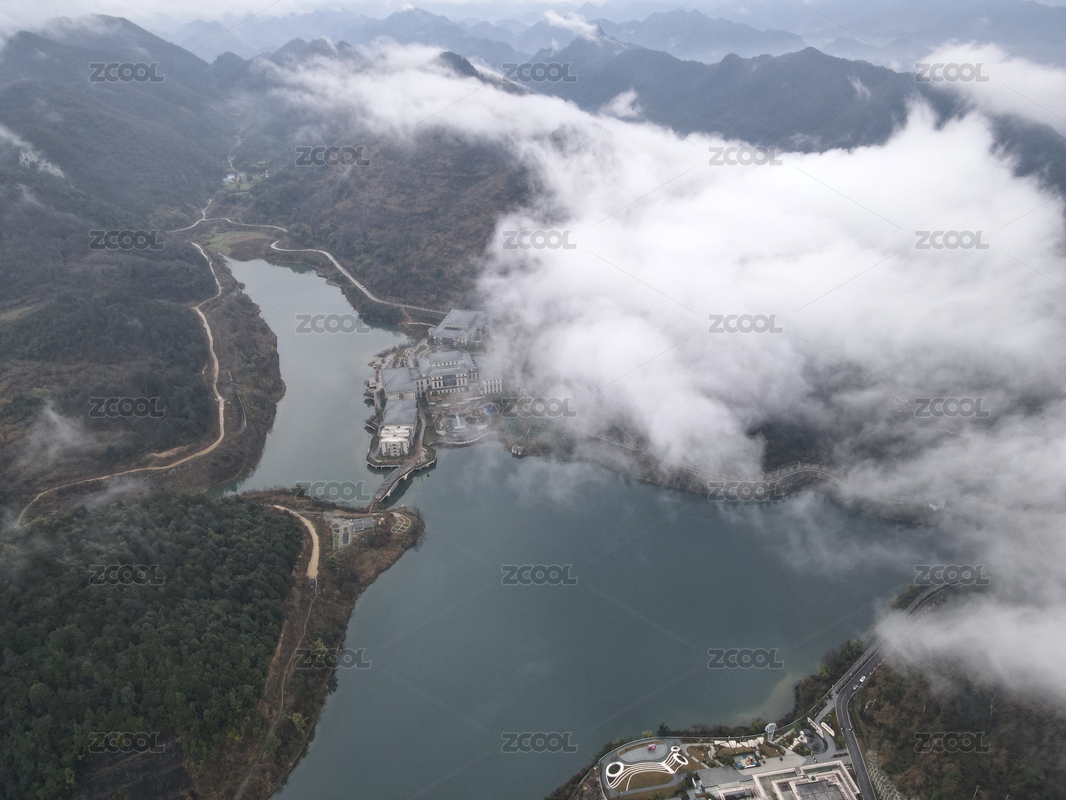 云南,丽江,玉龙雪山,蓝月谷,云雾缭绕,高空,航拍,蓝色,树林,美景