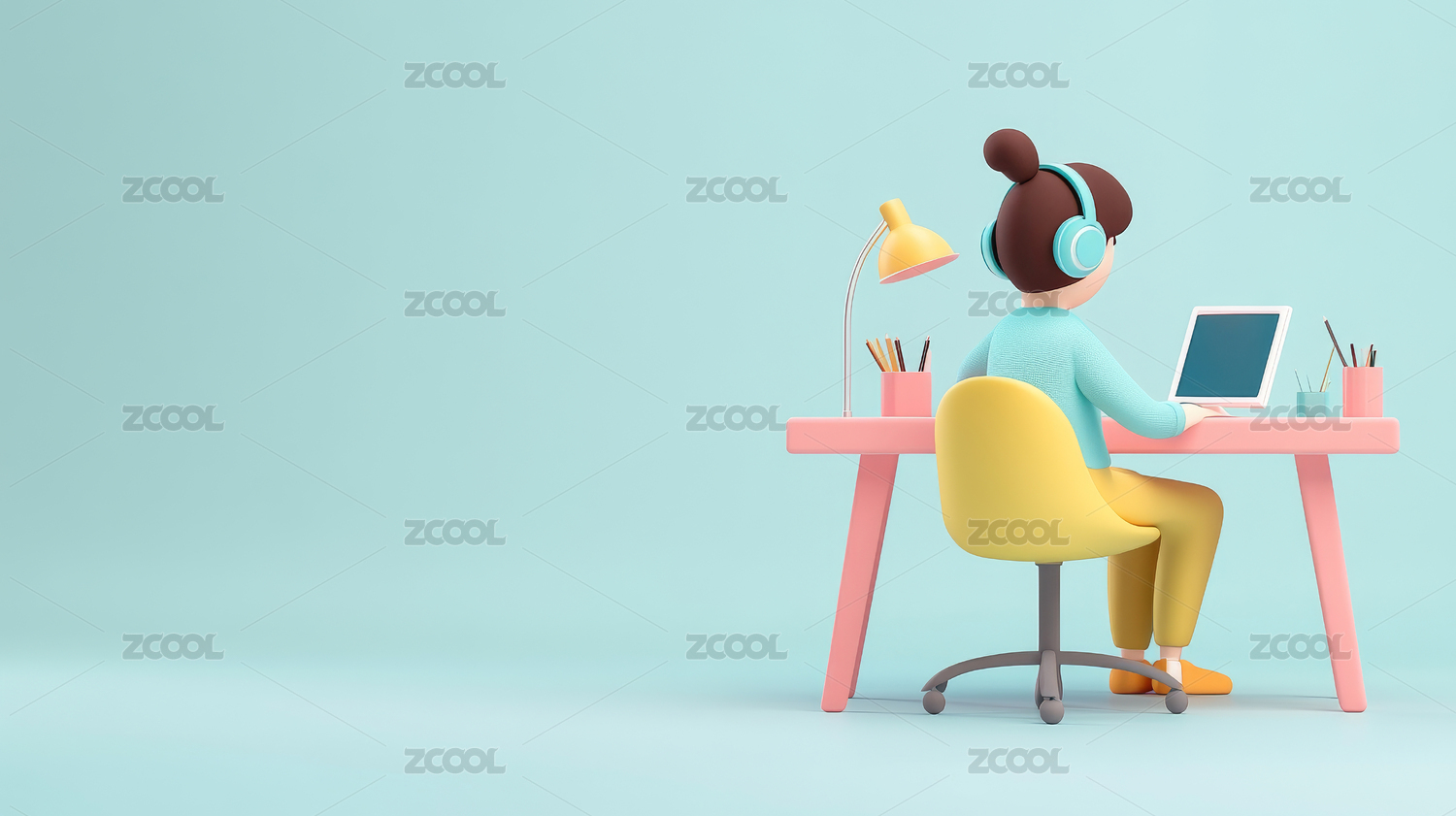 盘腿坐使用电脑双手抱头的男青年3D插画