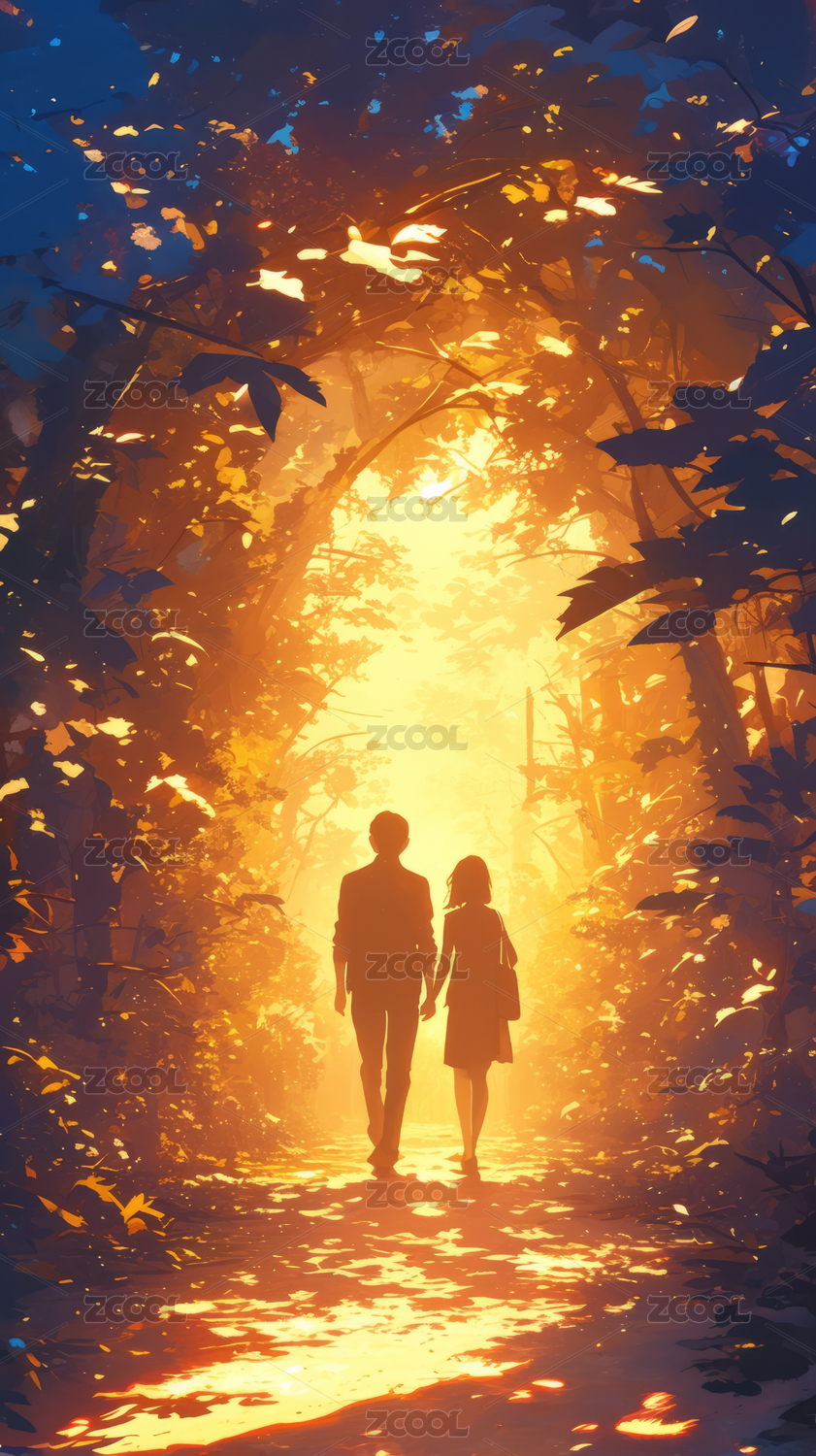 两个剪影在灯光照耀的森林中漫步