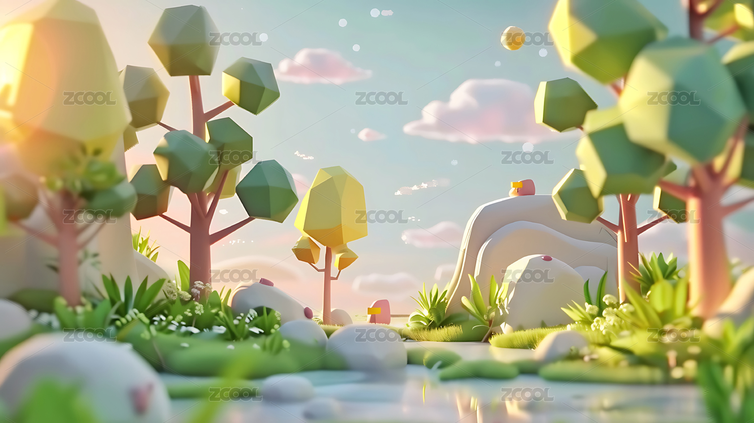 白天夏天长在石缝砖缝的树3D卡通立体插画