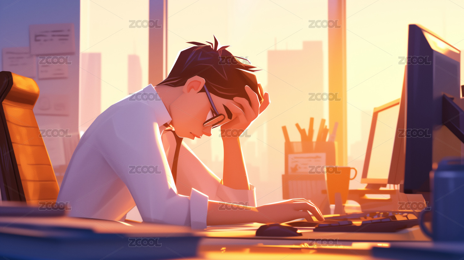一个男人坐在办公电脑前双手挠头,表情痛苦