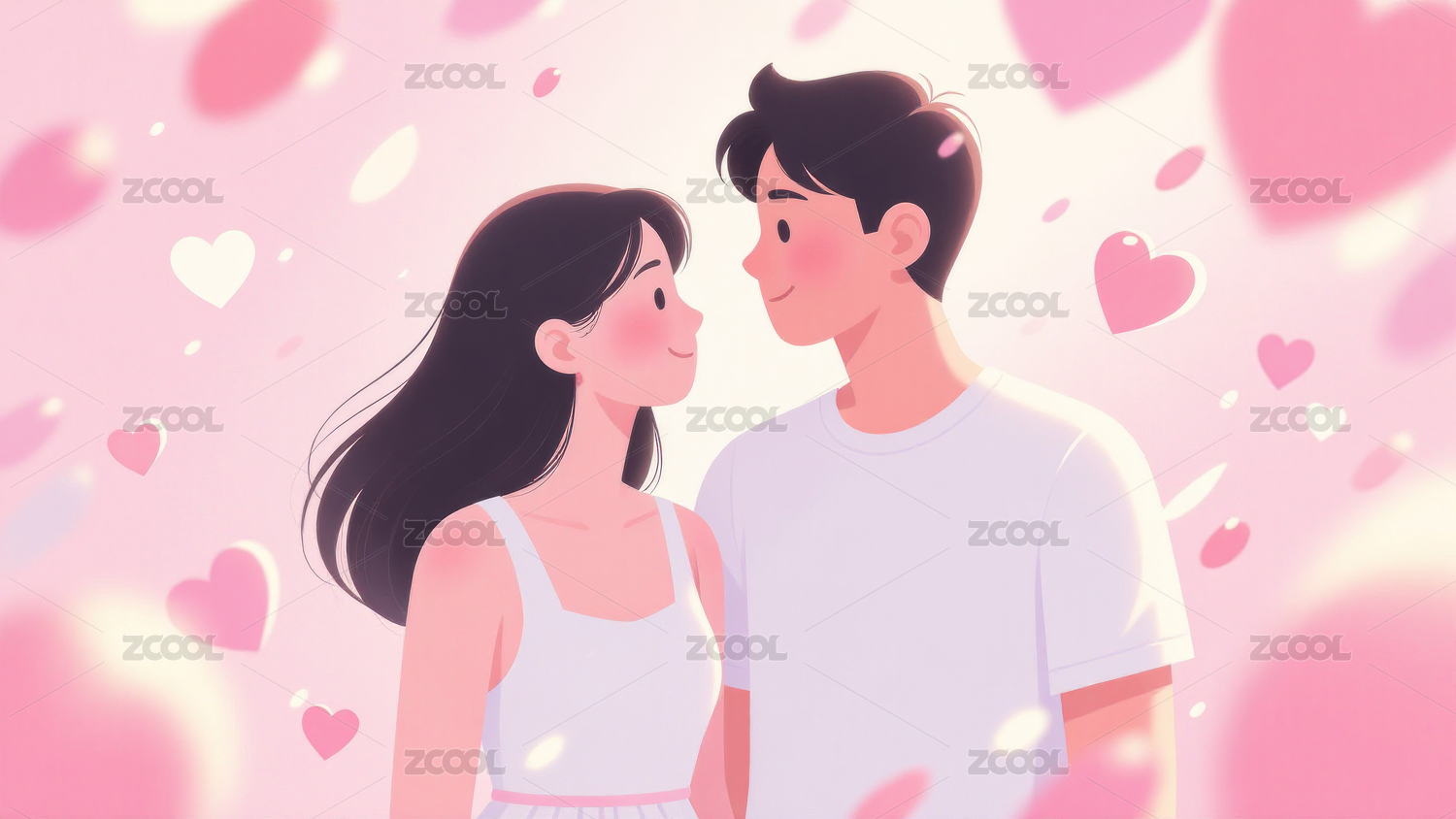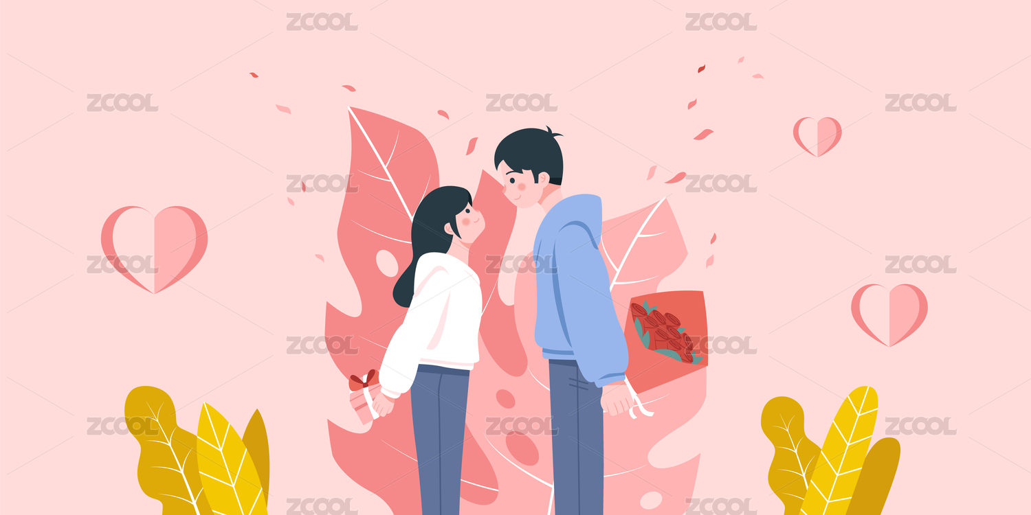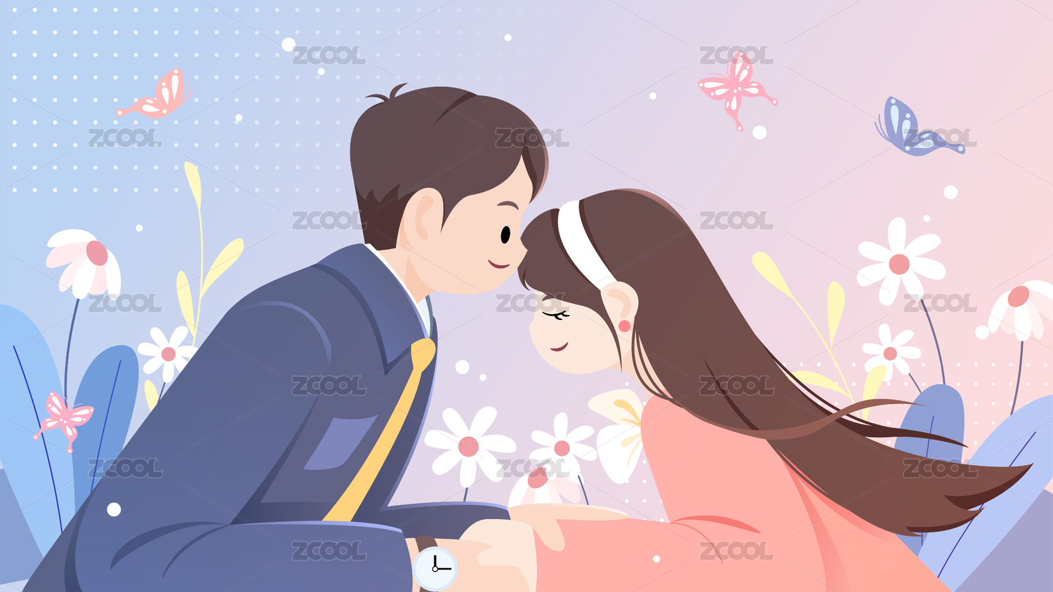 一对情侣牵手亲吻治愈系扁平矢量插画