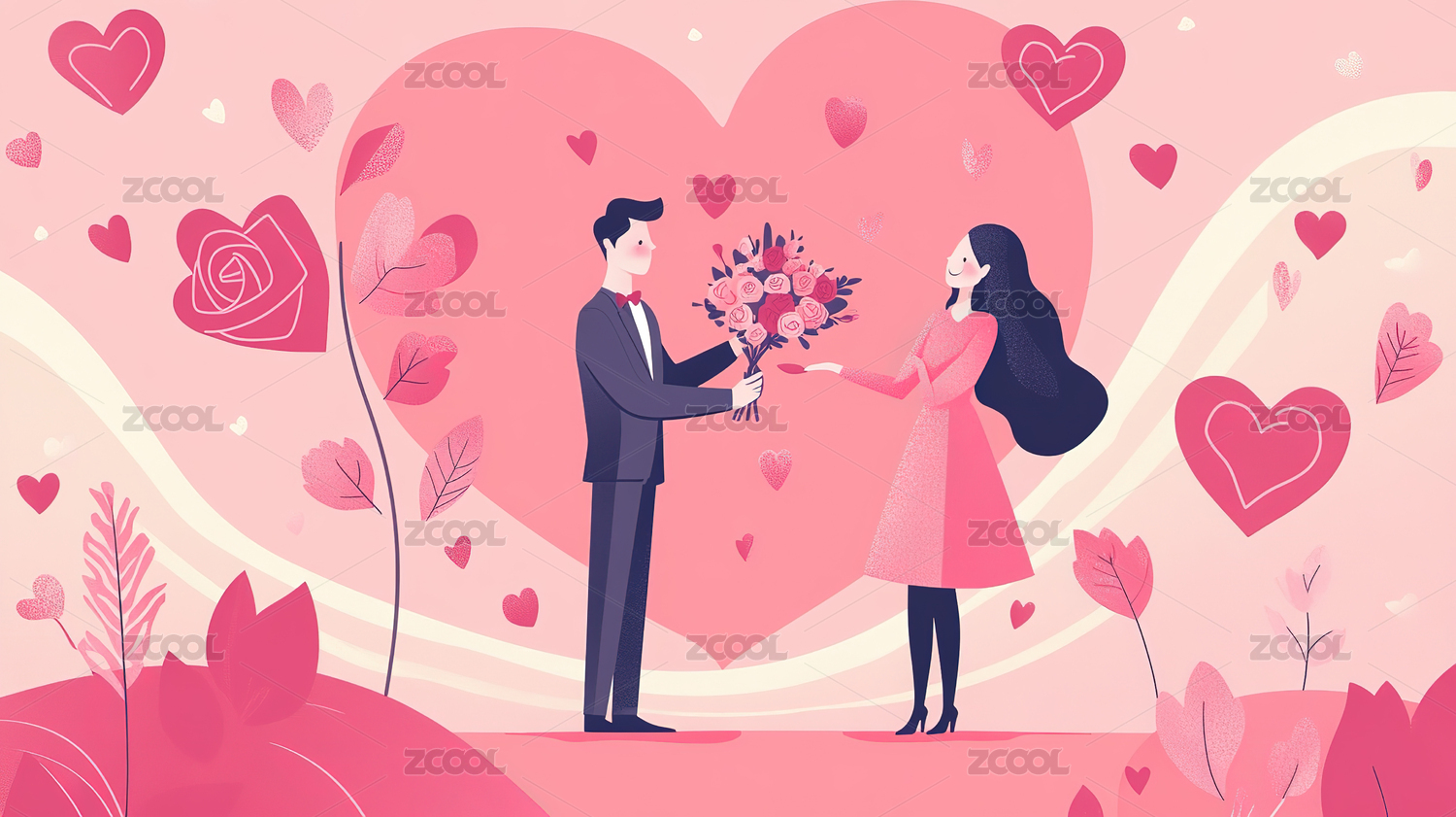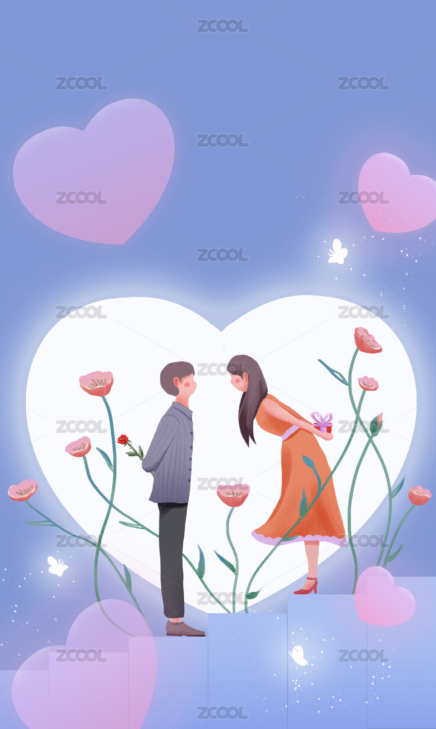 情侣在爱心礼盒里跳舞爱心背景抽象插画