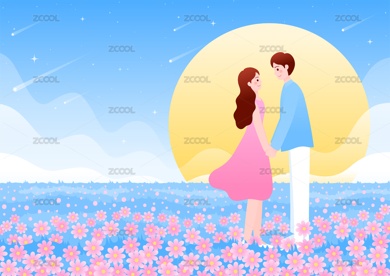 七夕情人节星空下情侣甜蜜约会矢量插画