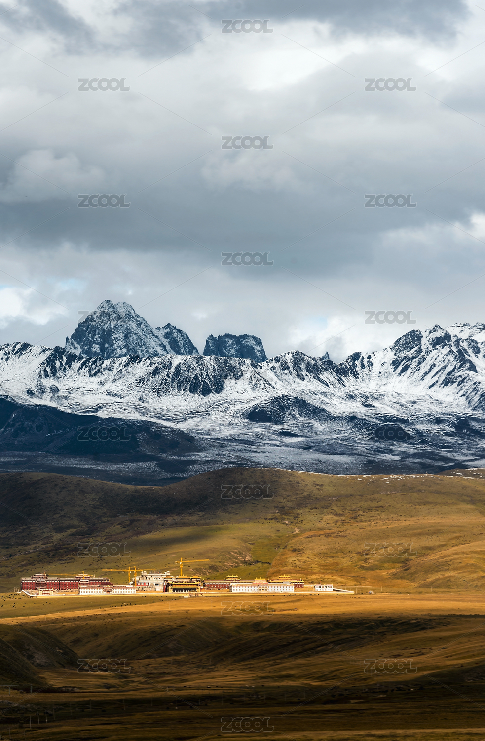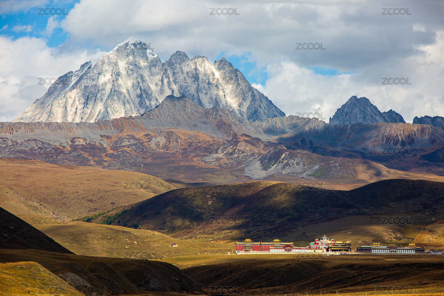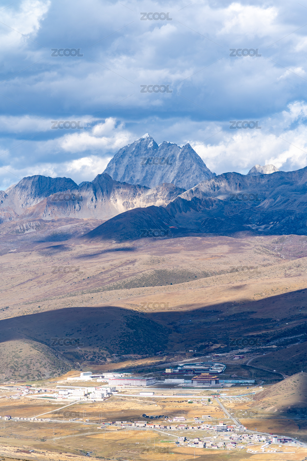 四川甘孜州雅拉雪山和山下的寺庙