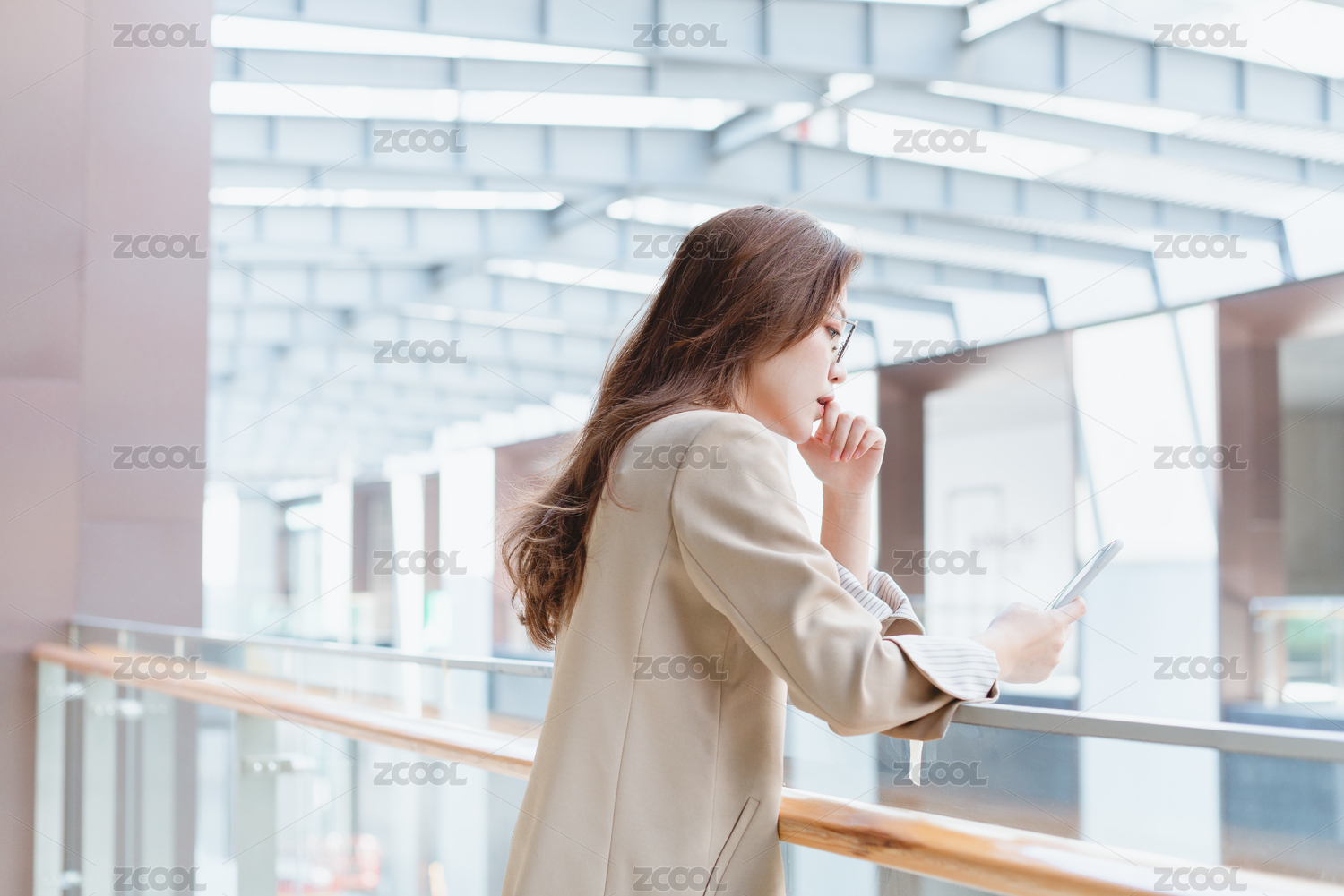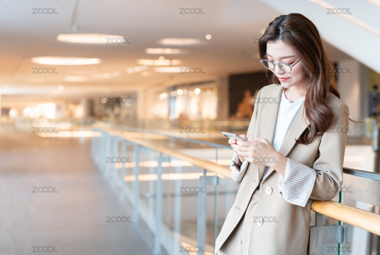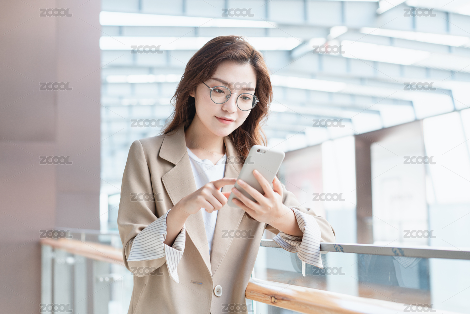 年轻亚洲商务人士倚靠在室内栏杆旁看手机