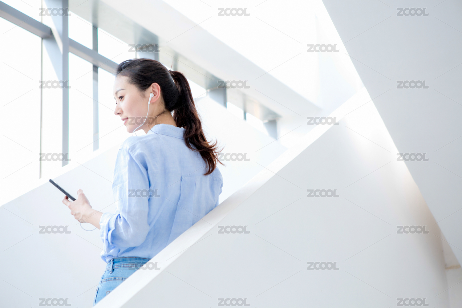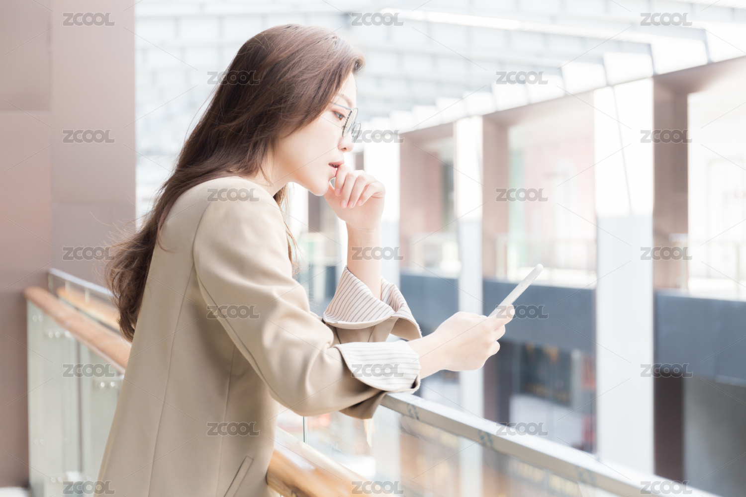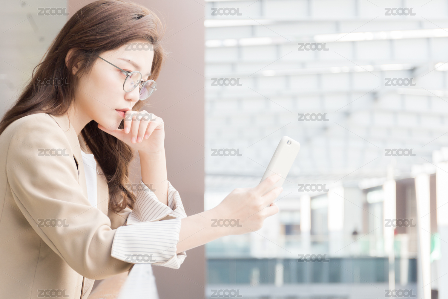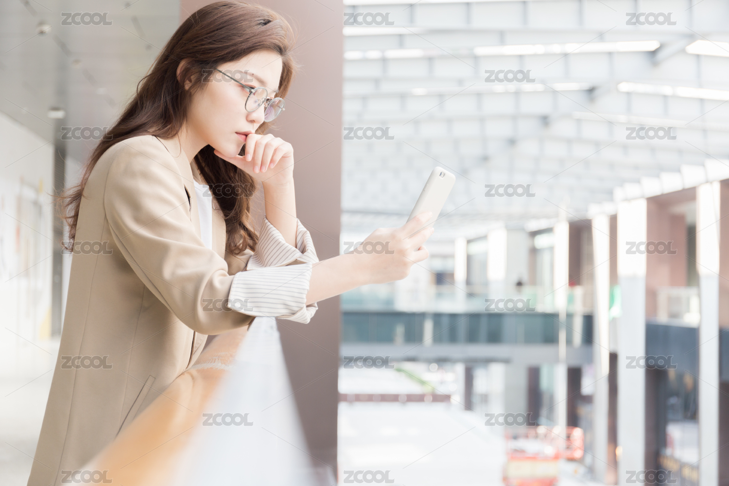 年轻亚洲商务人士倚靠在室内栏杆旁看手机