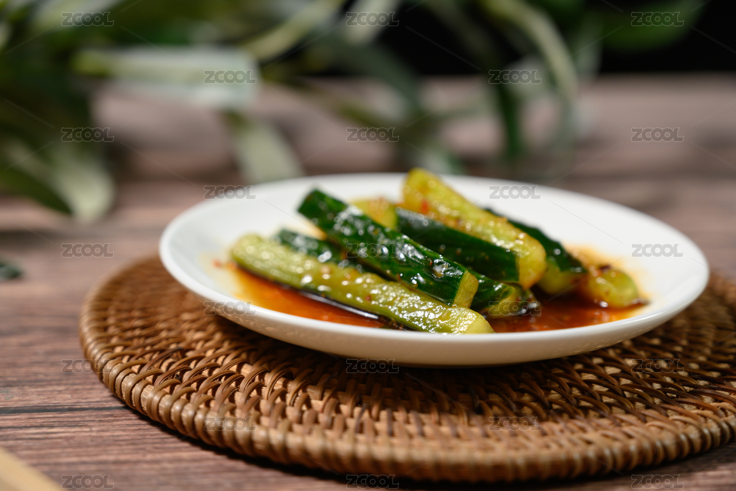 桌面上的盘子里的美味可口的凉拌青瓜