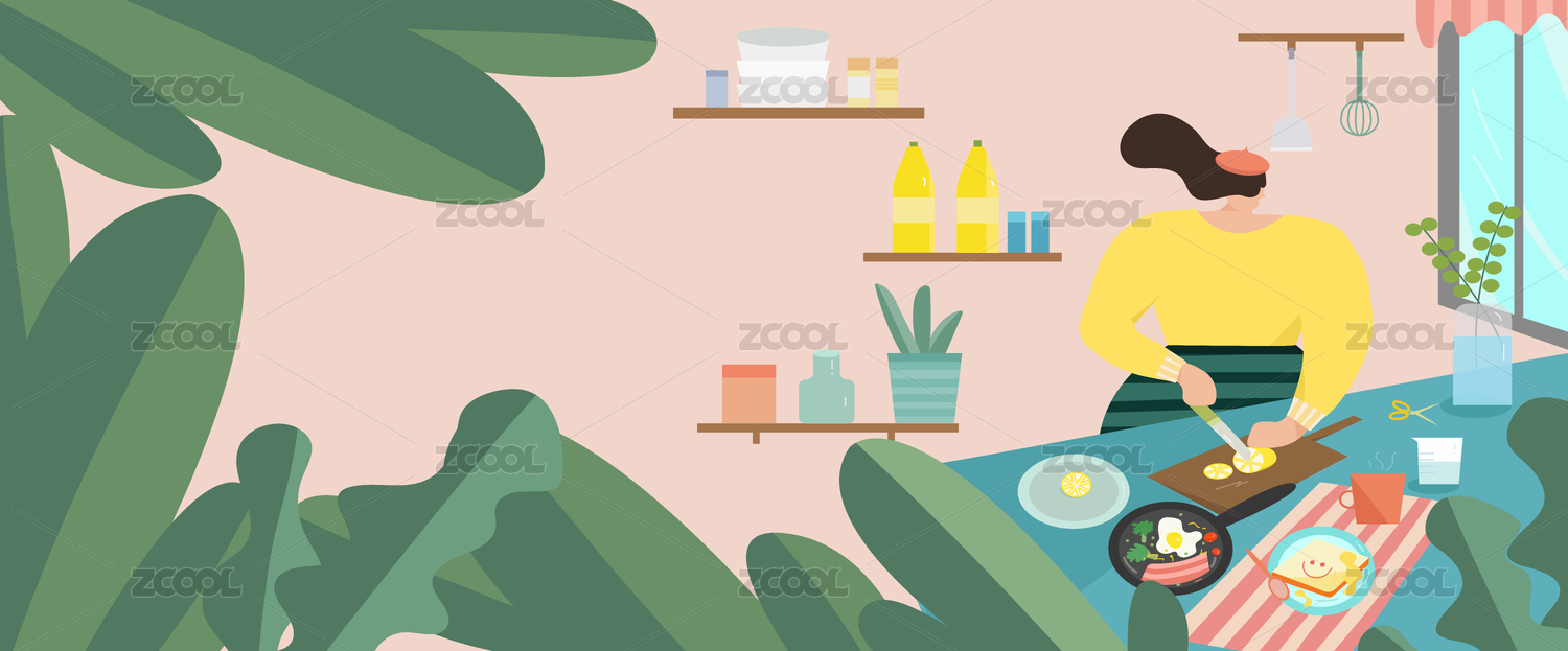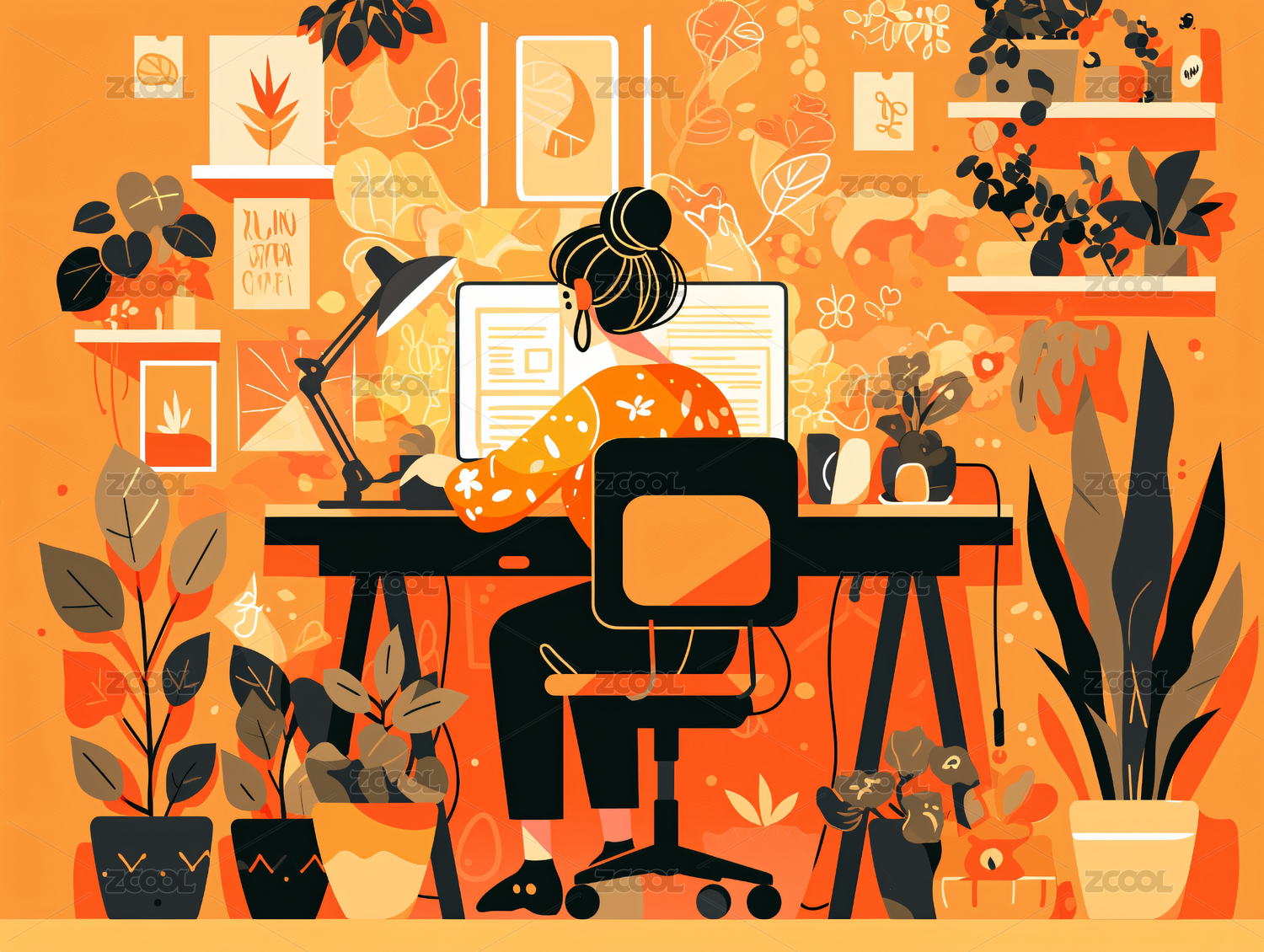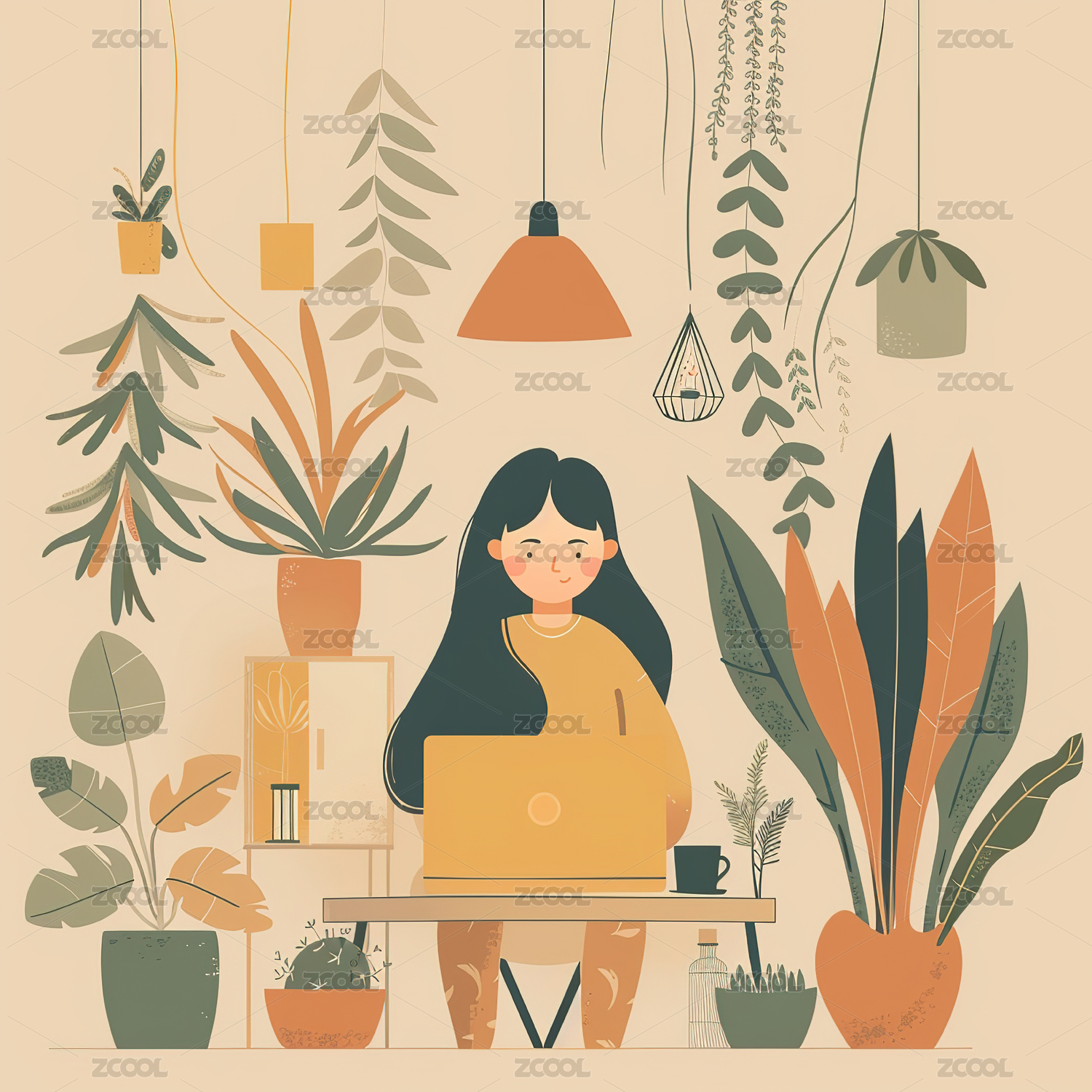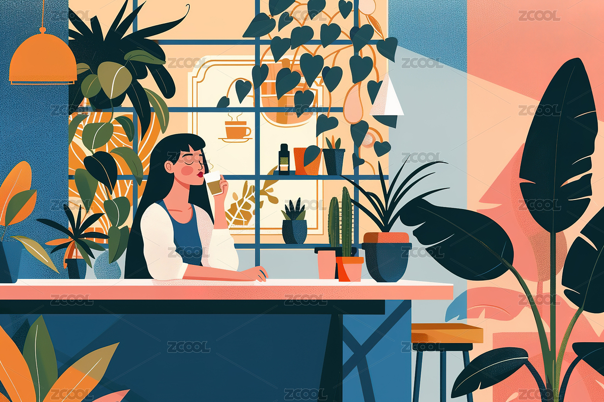 坐在摆满绿植的小众咖啡馆的年轻女性