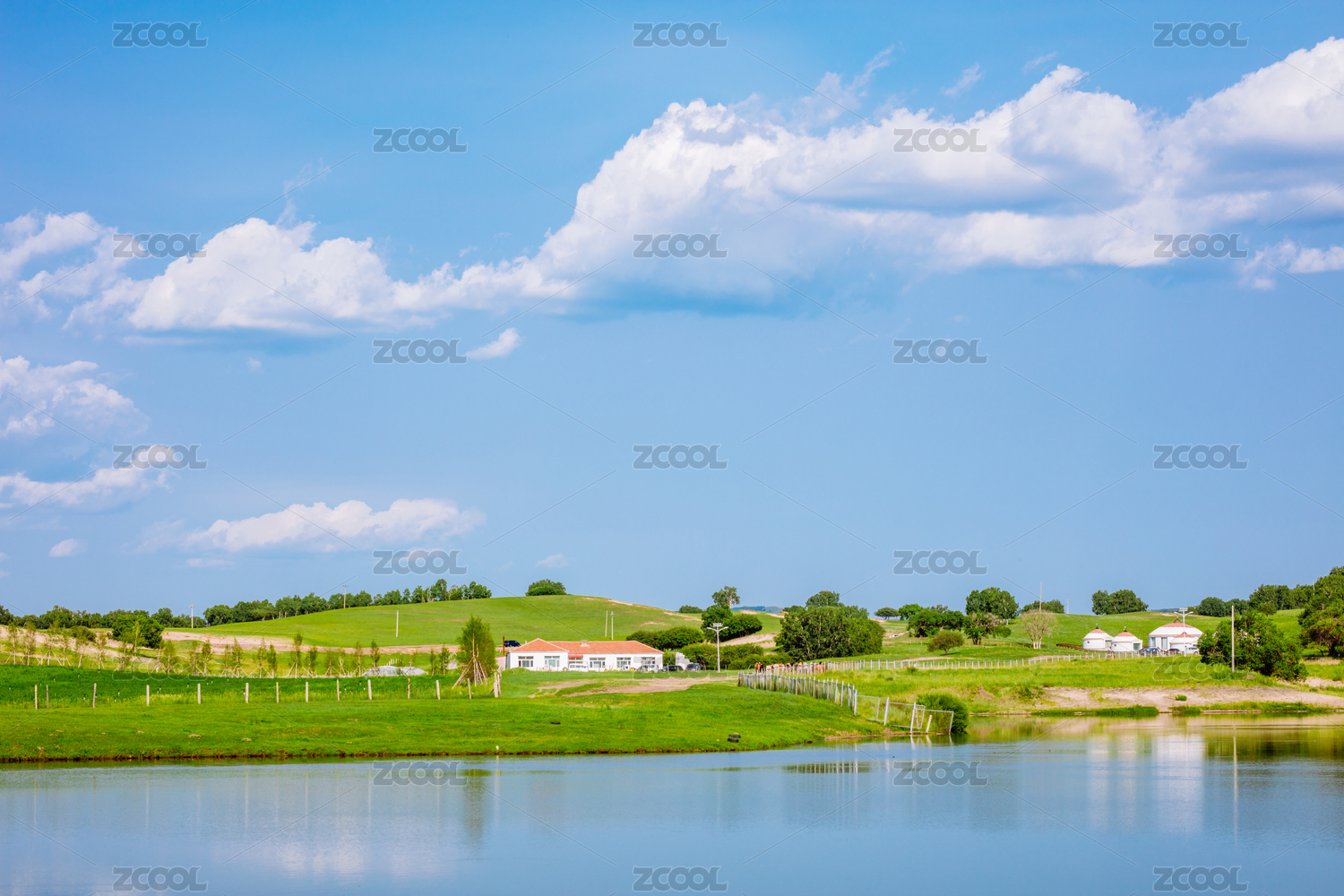 中国四川省德阳市黄许镇,蓝天下的鱼塘景色