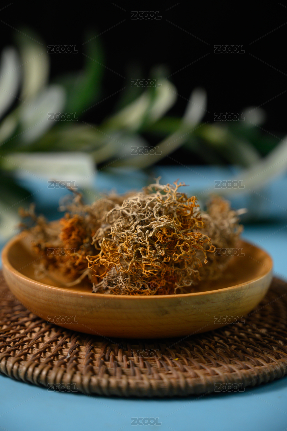 桌面上的盘子里的干爽的花草茶
