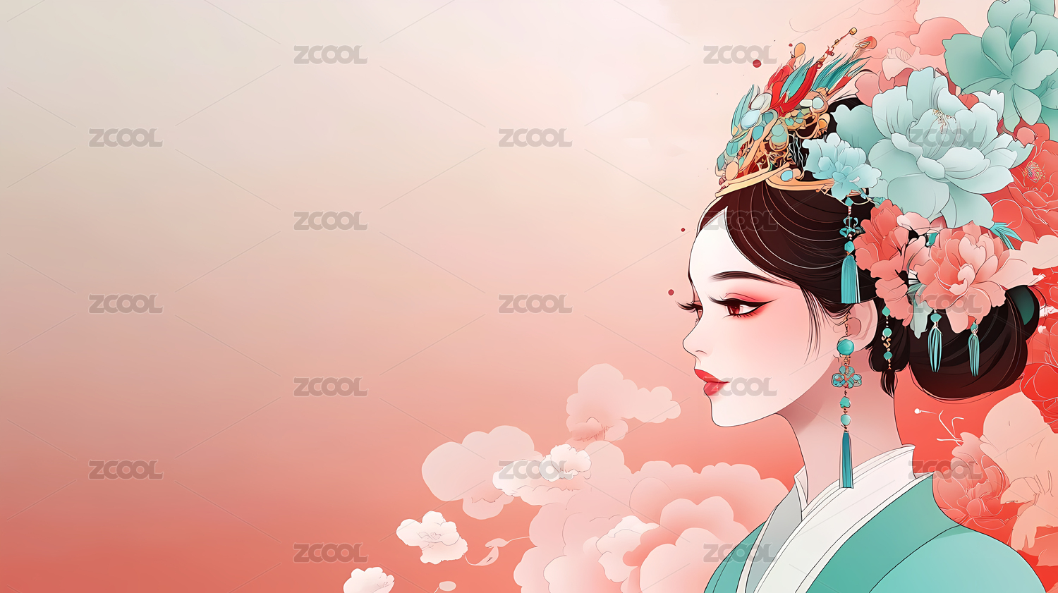 粉色丝绸汉服东方美人牡丹花唯美三维插画