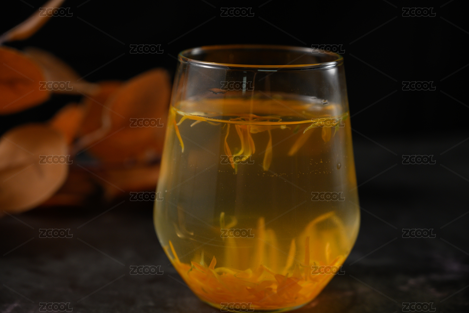 桌面上的杯子里的甘甜可口的金盏菊花茶