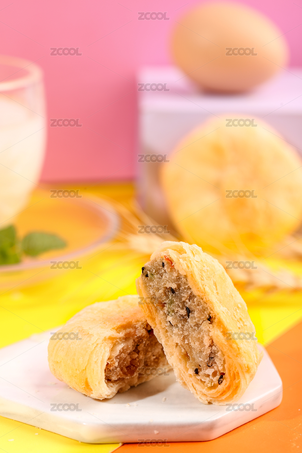 双色彩底上放着一盘五仁月饼