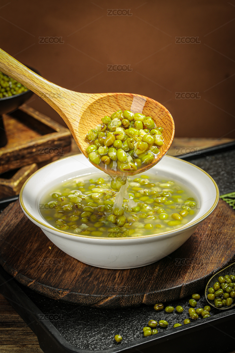 消暑饮品一碗绿豆汤与绿豆特写木桌面背景