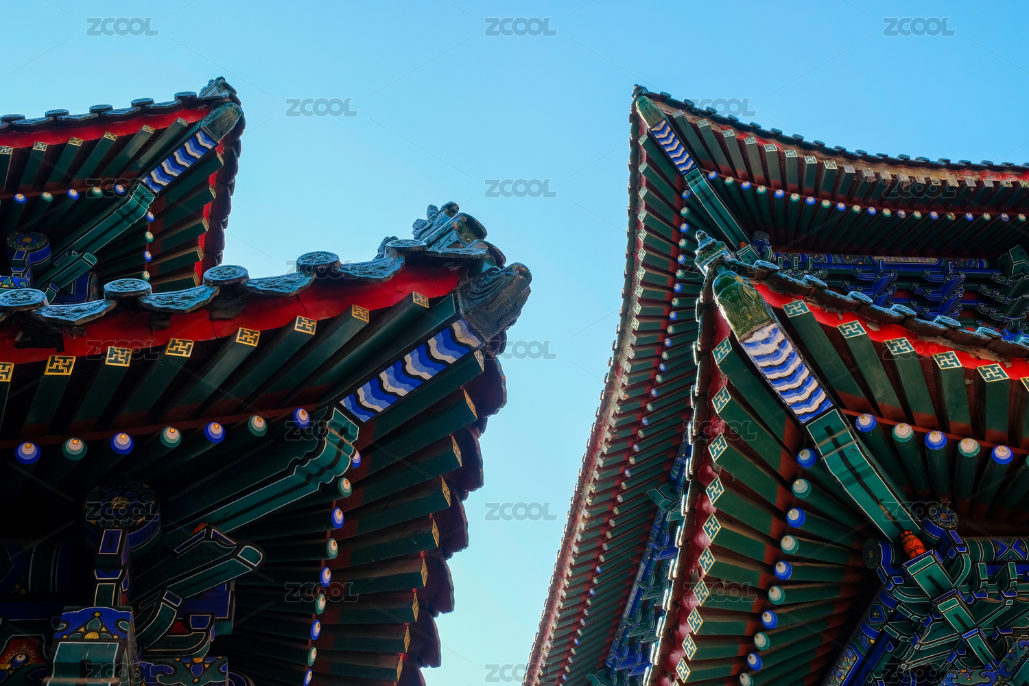 蓝天下的北京中山公园宰牲亭屋顶房檐特写