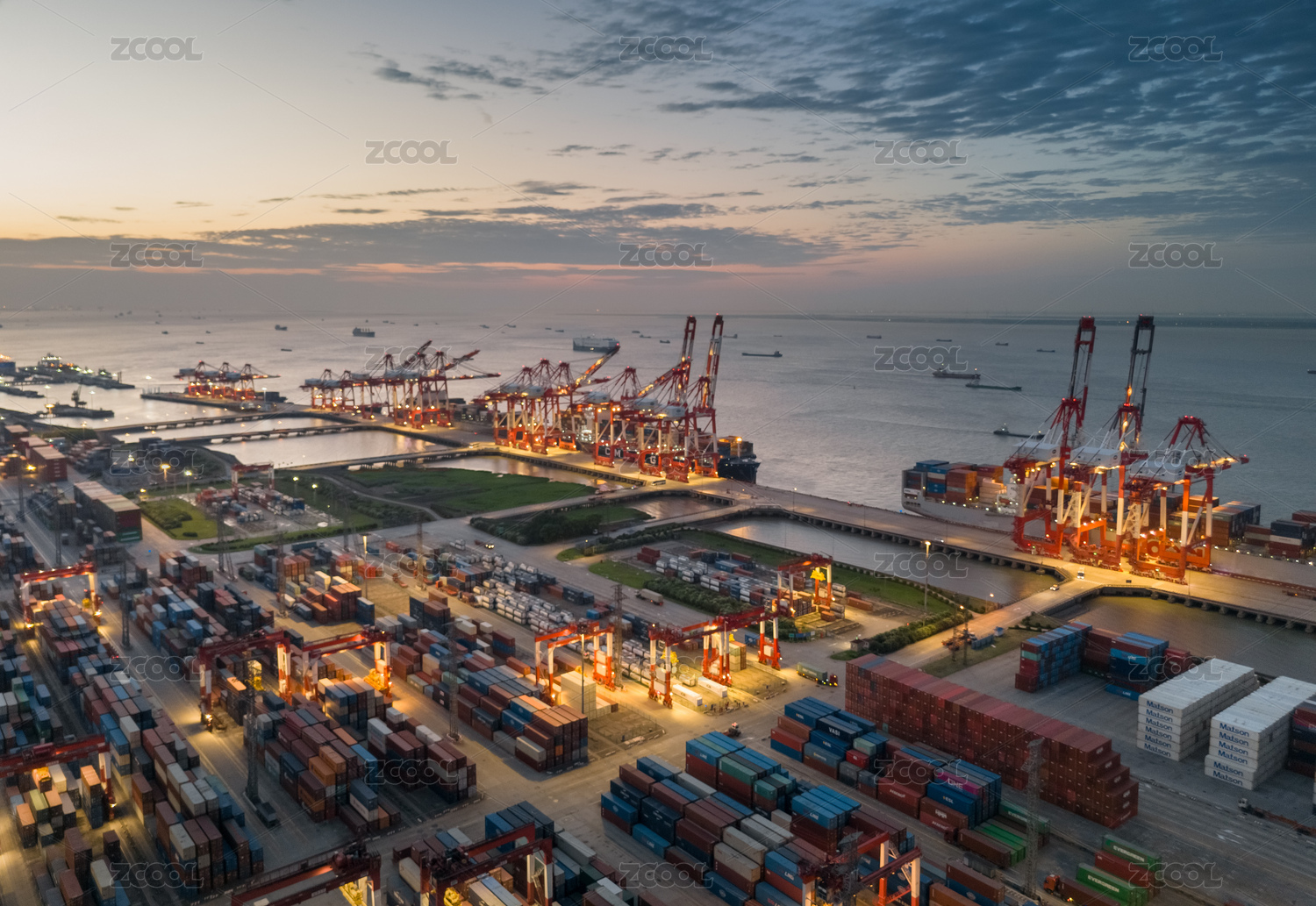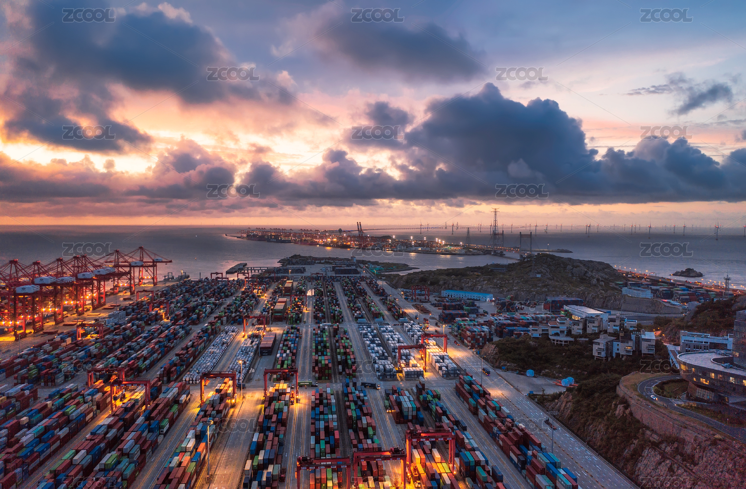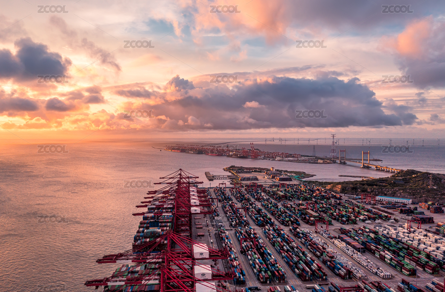 中国,浙江,舟山,嵊泗,洋山港,港口,海运,航拍,火烧云,日落