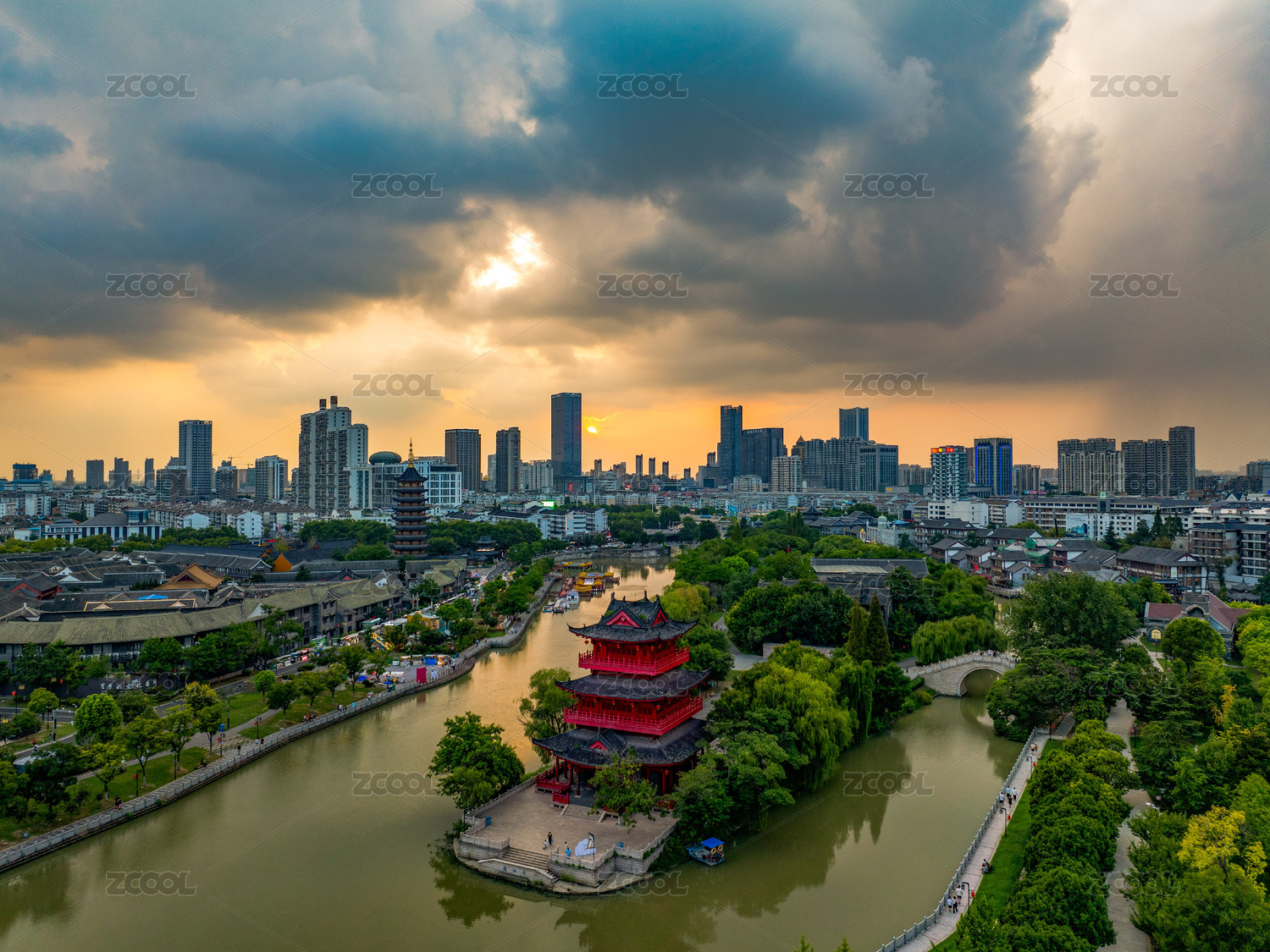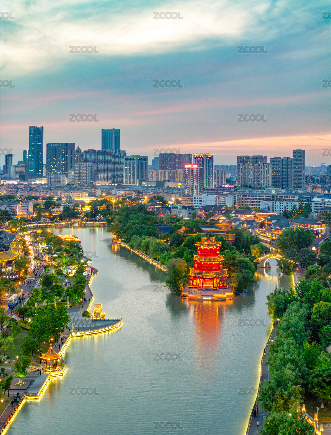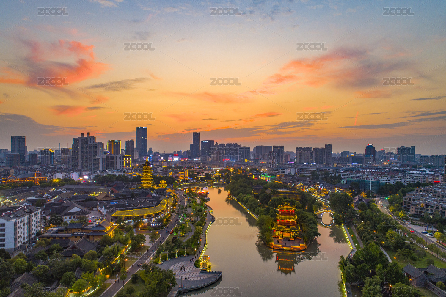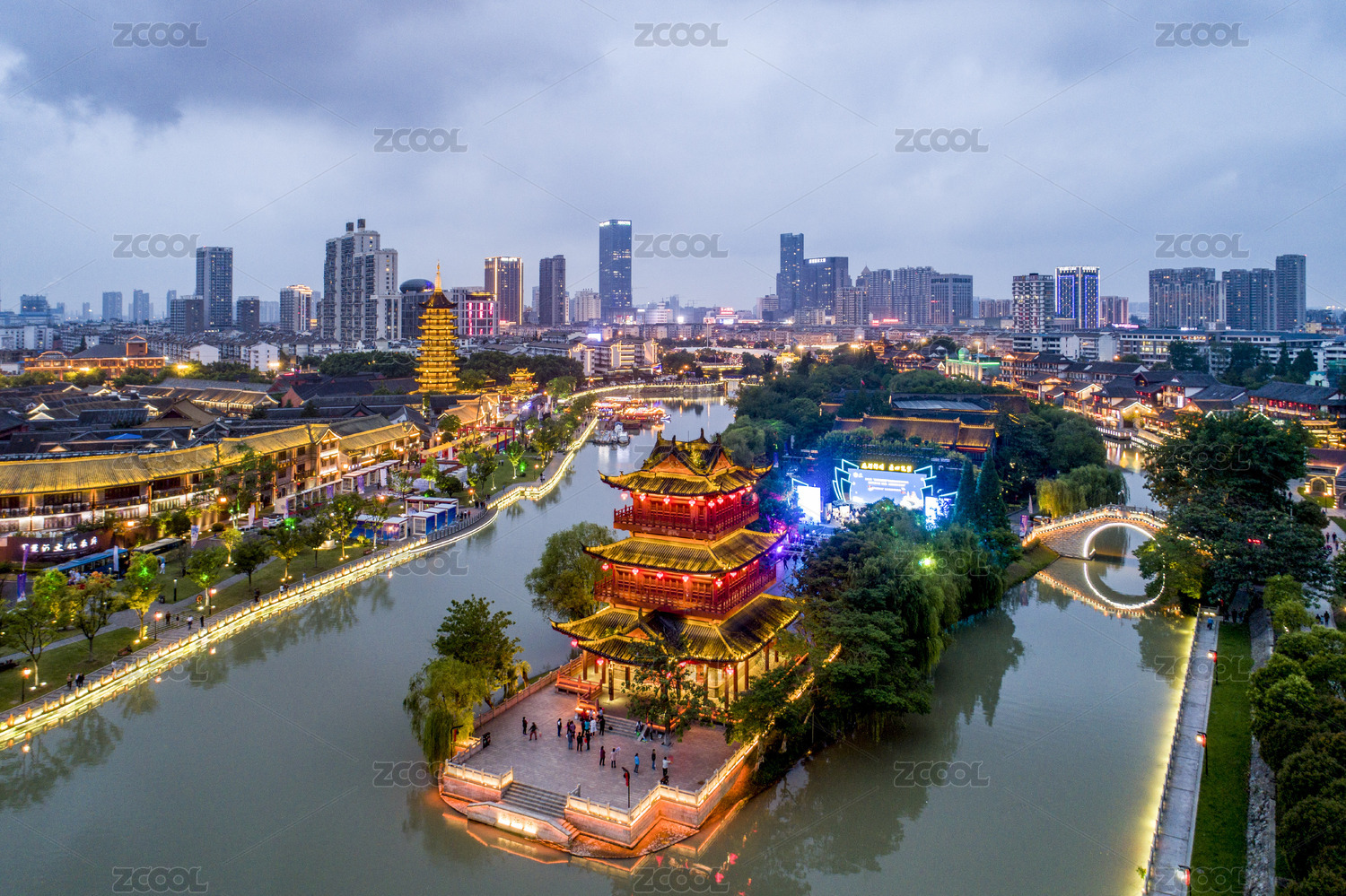 亭台楼阁,古代建筑,倒影,晚霞,黄昏时分,灯光照明,繁华,黄昏,历史遗迹,里运河