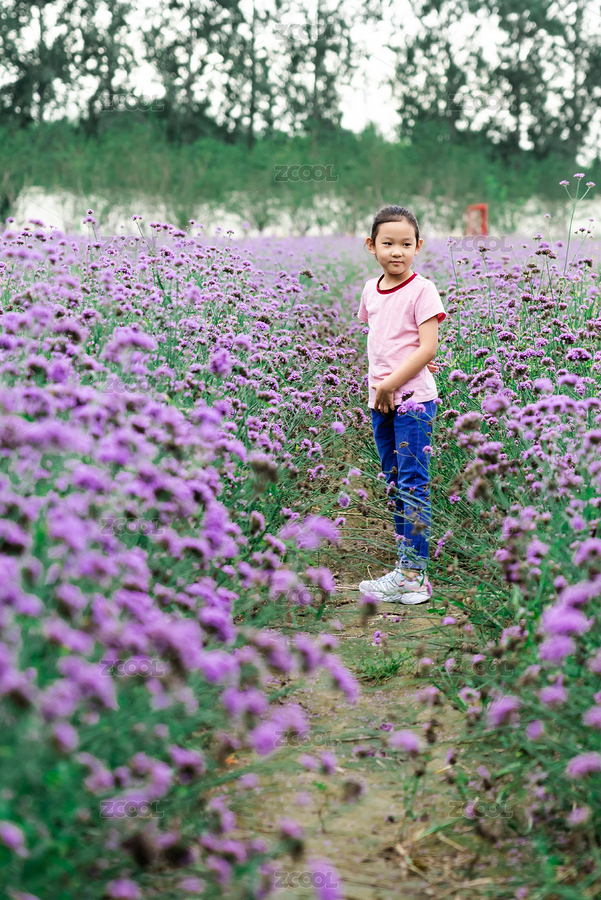 在紫色马鞭草花海中玩耍的小女孩