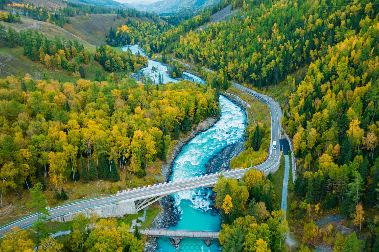航拍秋季的中国新疆喀纳斯河谷与山路风光