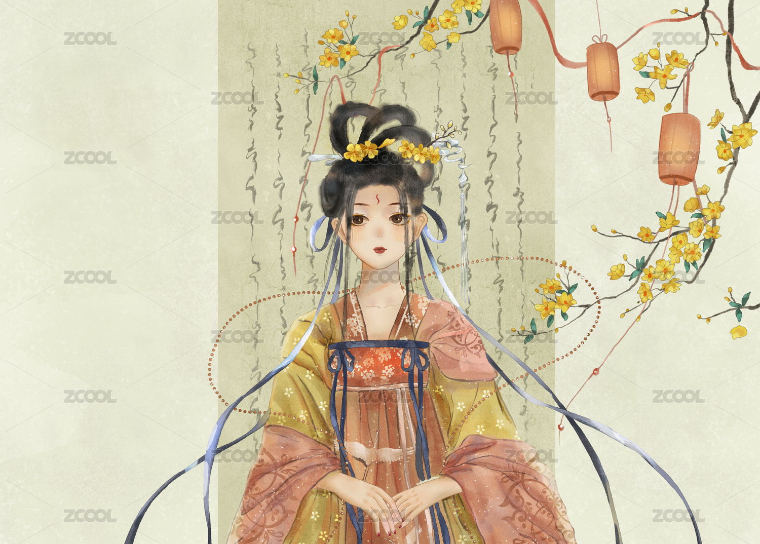 古风,女生,国风,扇子,中式,壁画,包装,植物,树叶,绿色