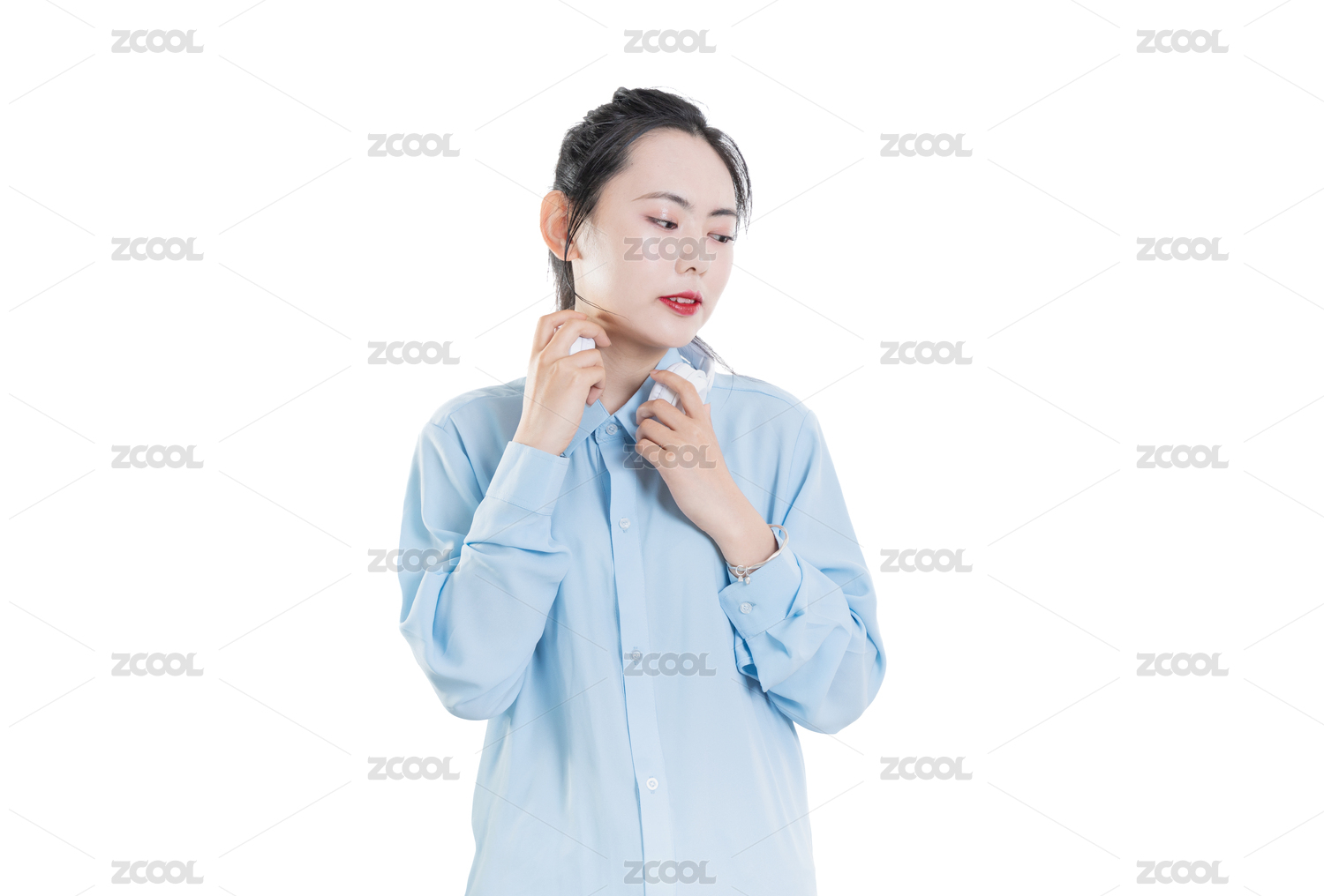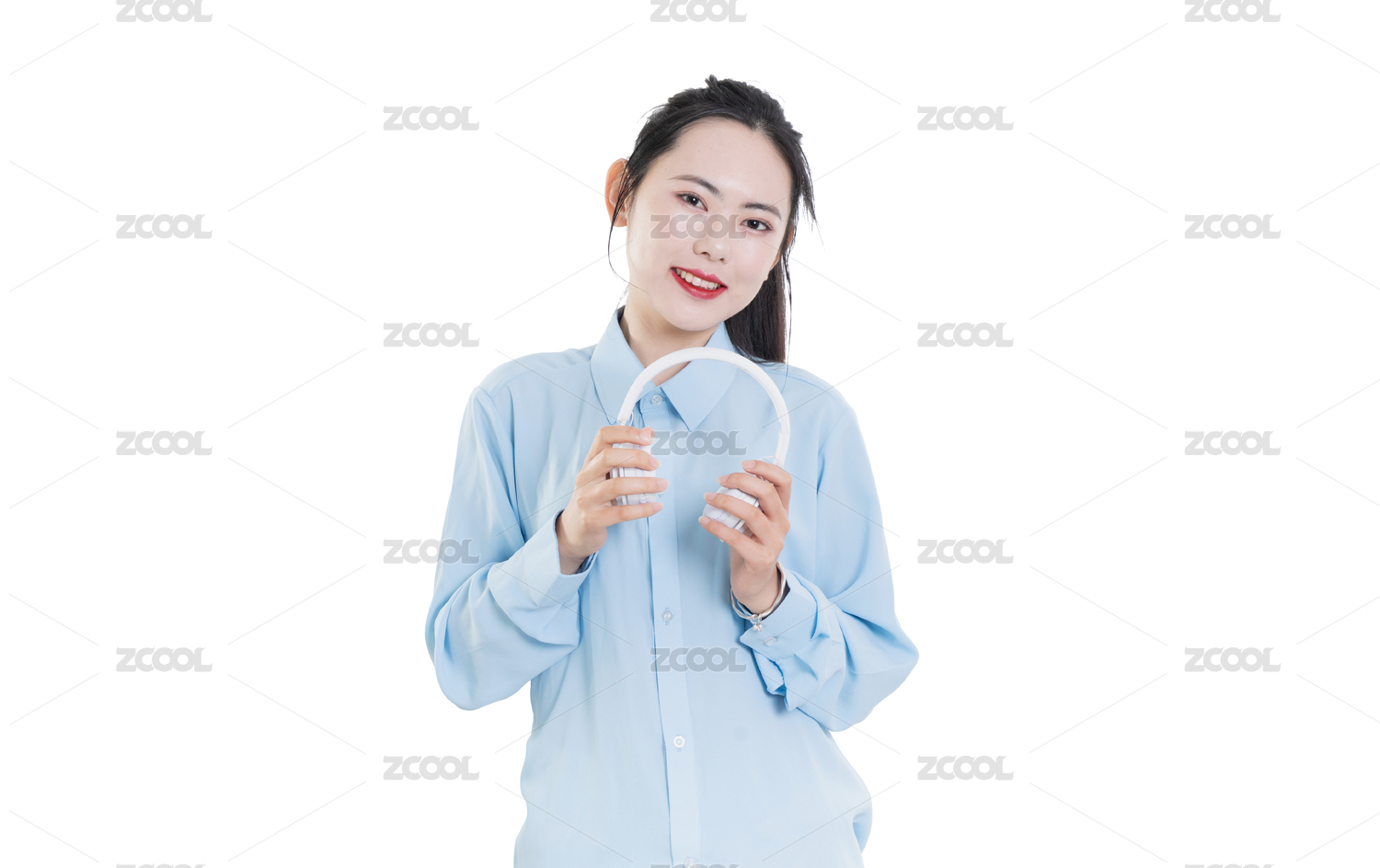 穿着蓝色衬衣戴着白色耳机的中国女孩