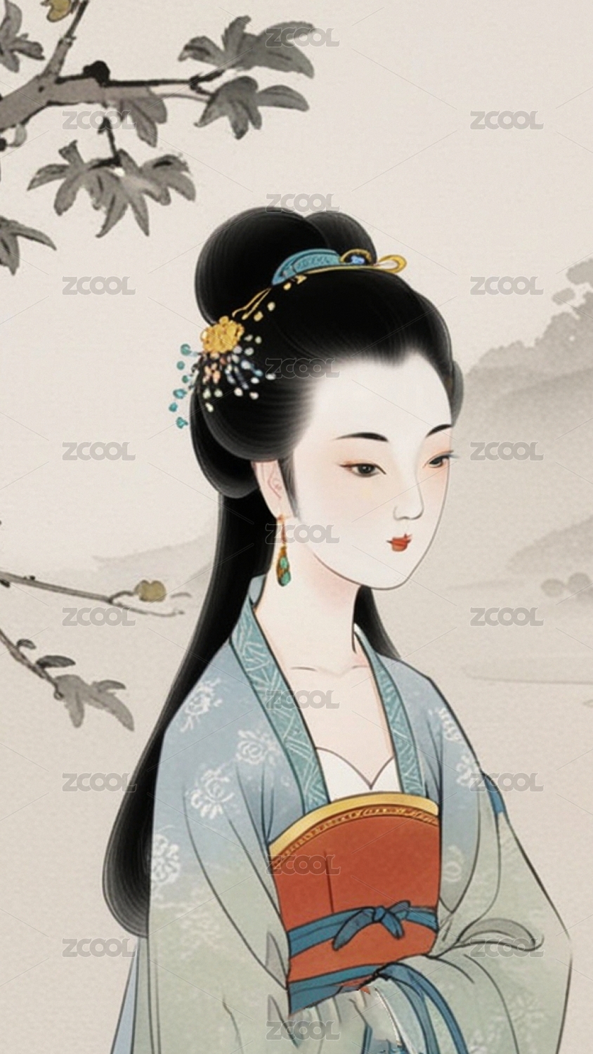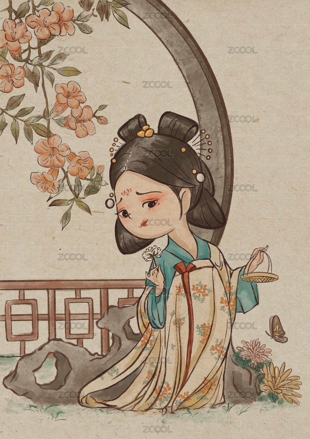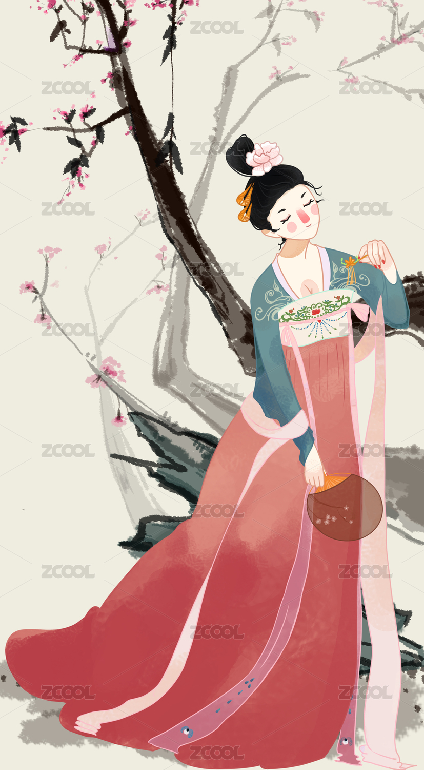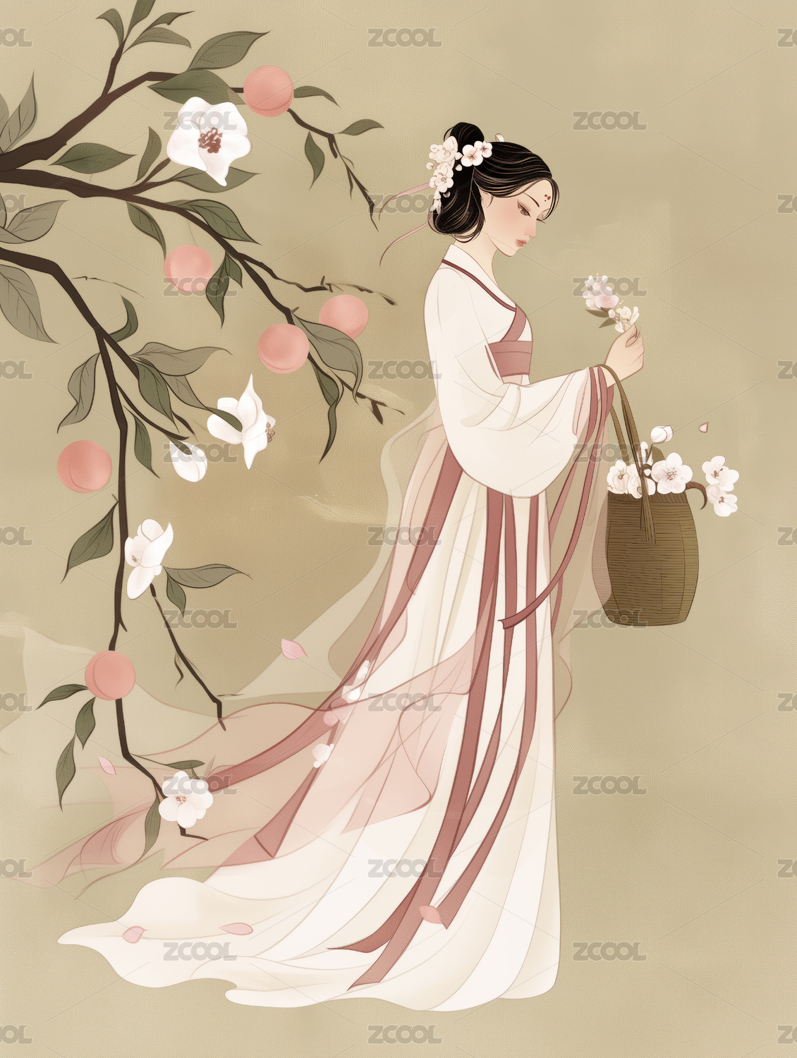 一个人,女人,工笔画,国画,古风,古装,连衣裙,优雅,竖构图,植物