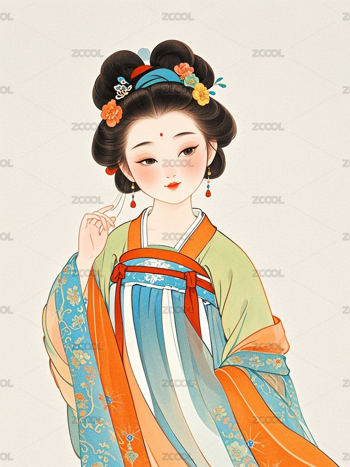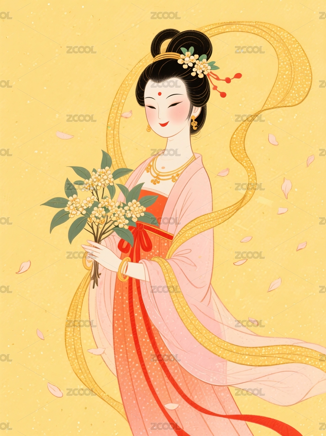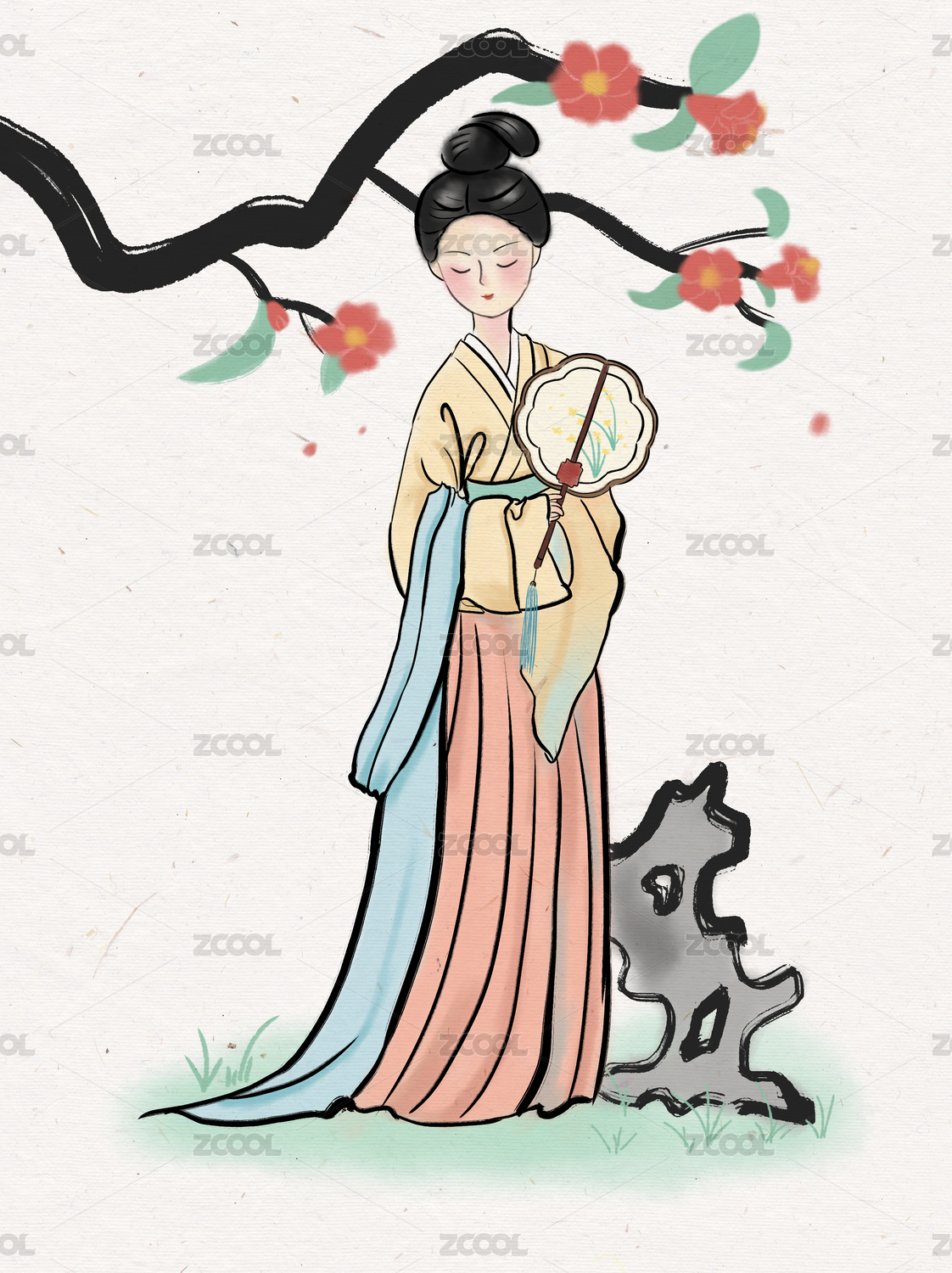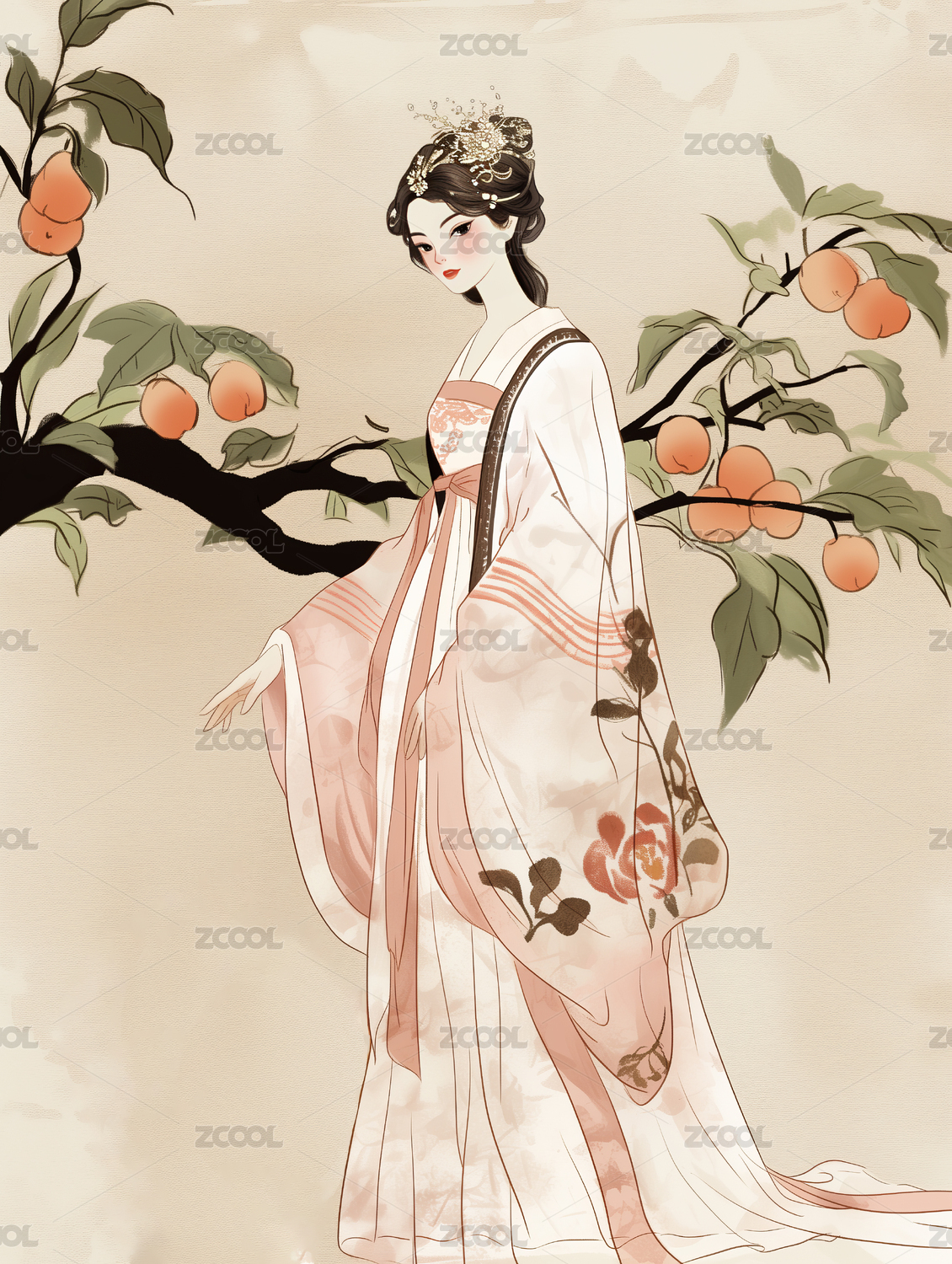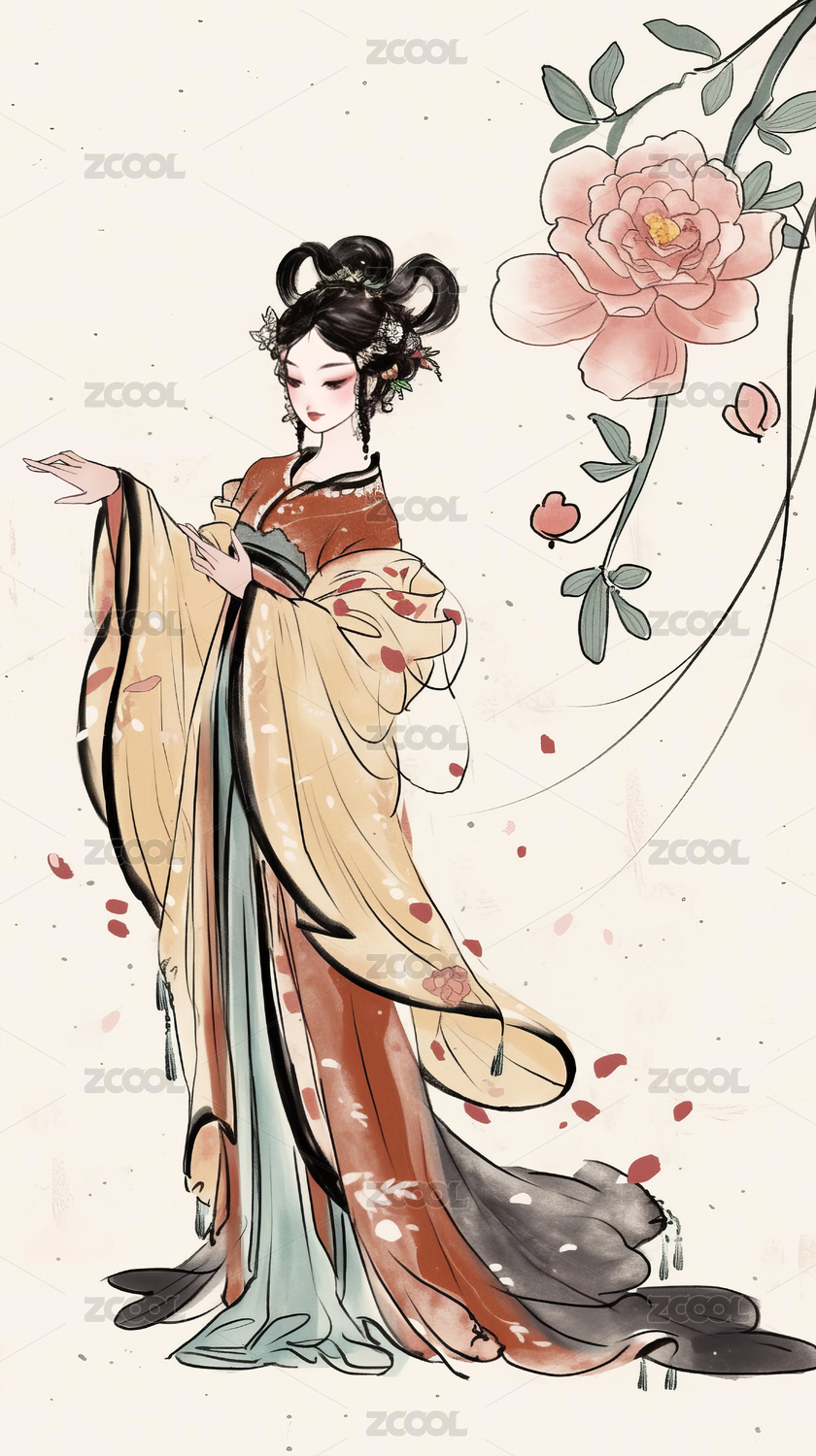一个人,女人,工笔画,国画,古风,古装,连衣裙,优雅,竖构图,植物
