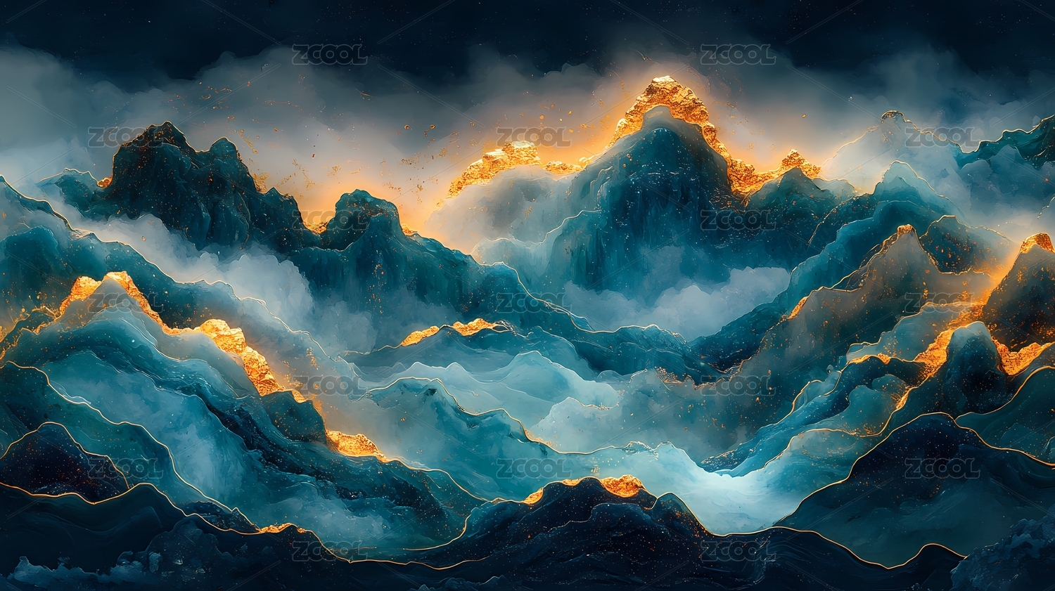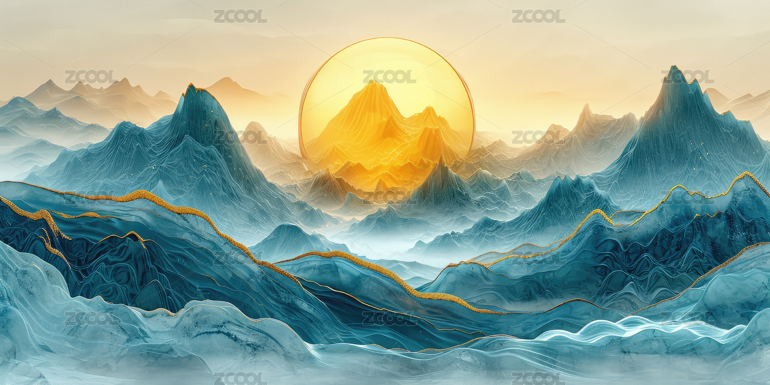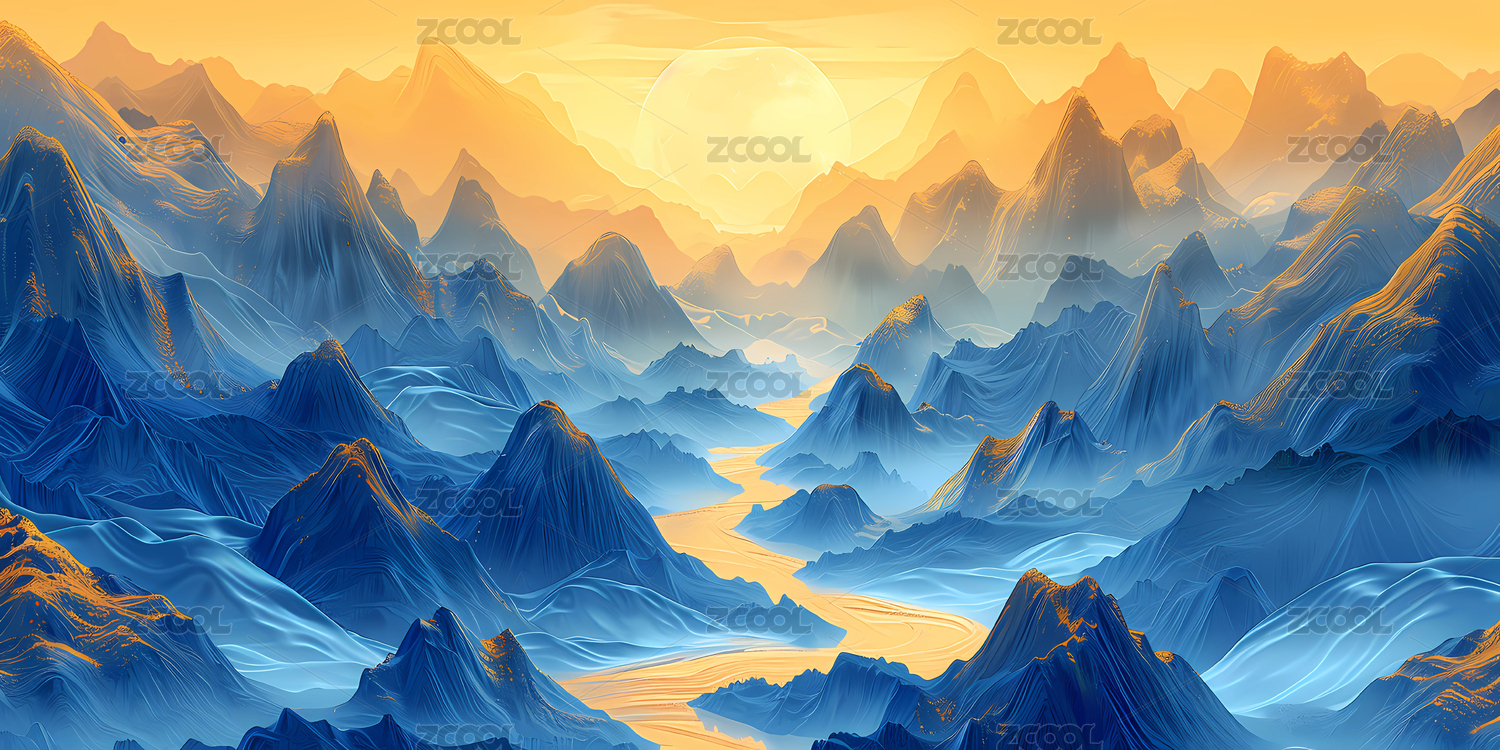 3D国风蓝色鎏金山脉中国山水风景插画