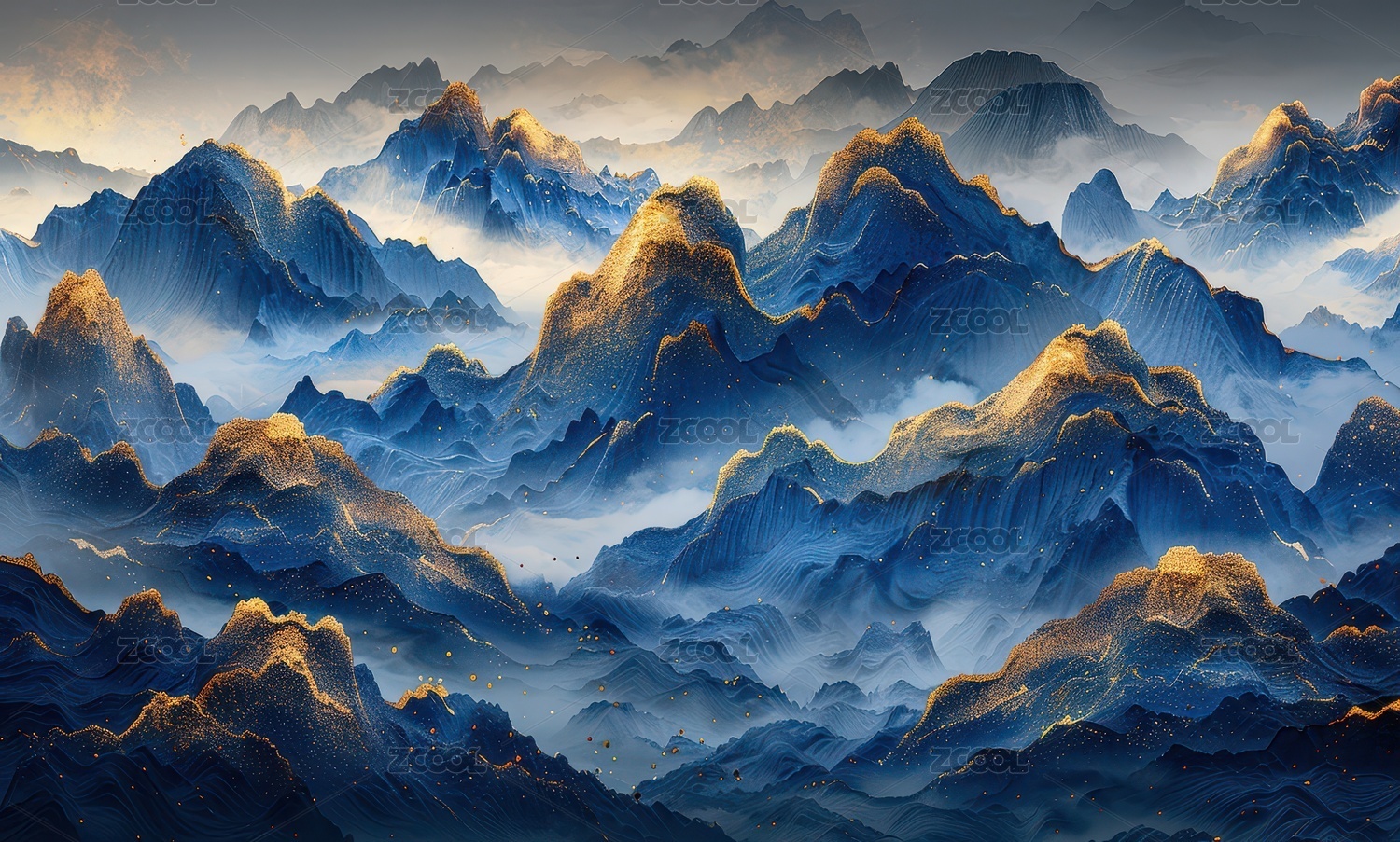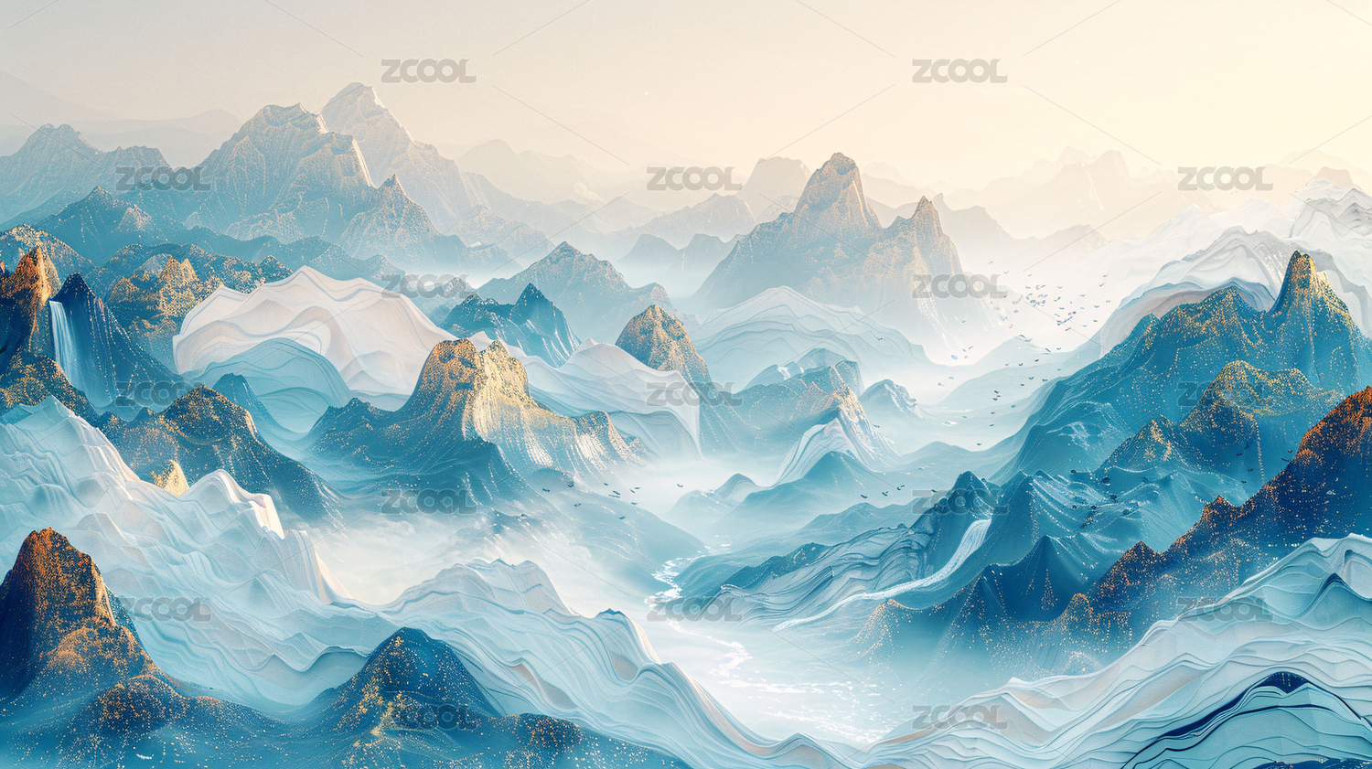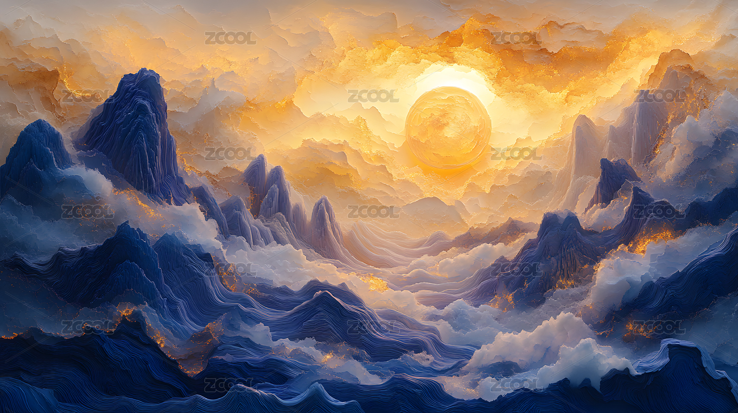 3D国风蓝色鎏金山脉中国山水风景插画