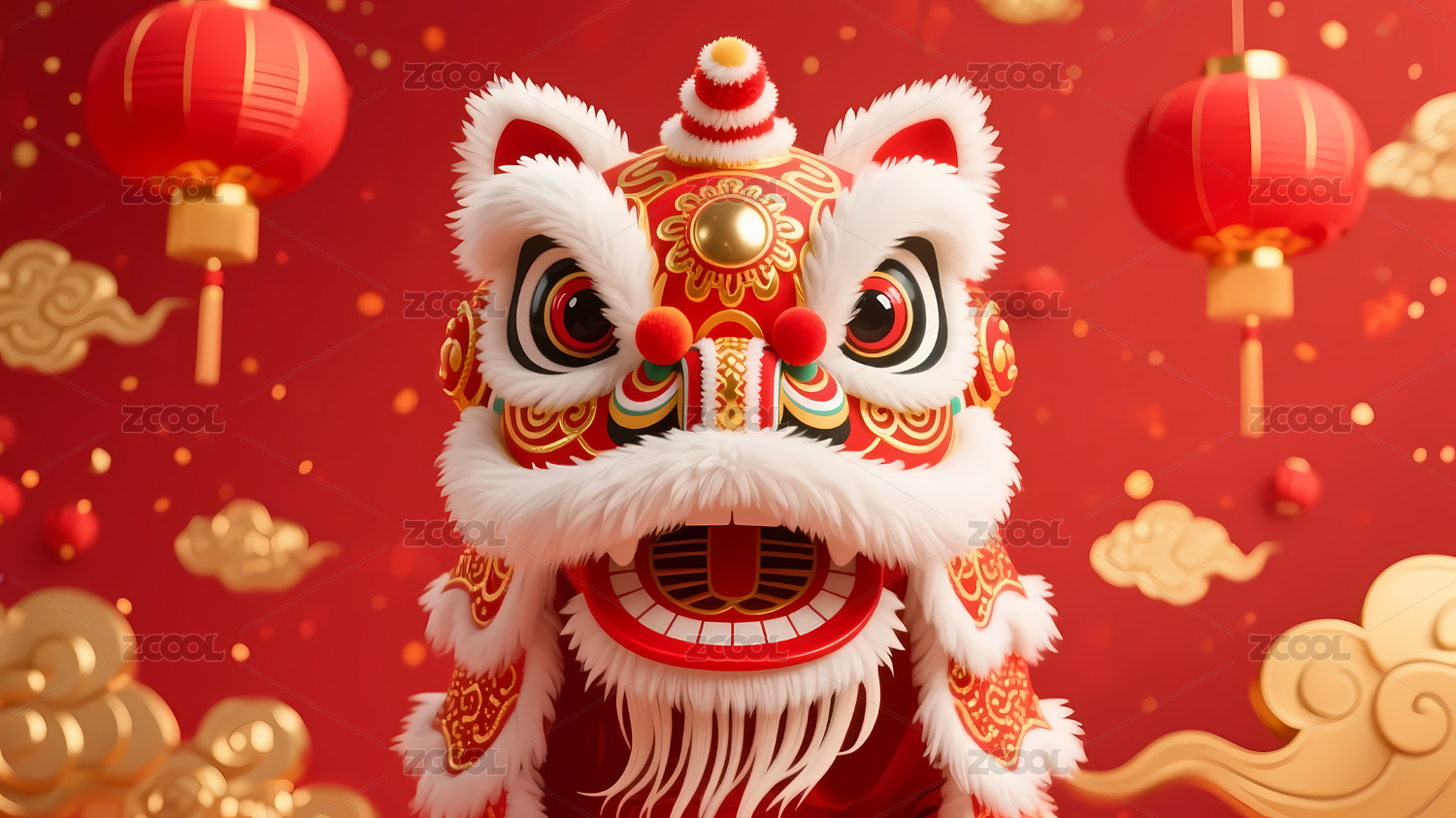 春节喜庆氛围下的可爱舞狮,寓意吉祥如意