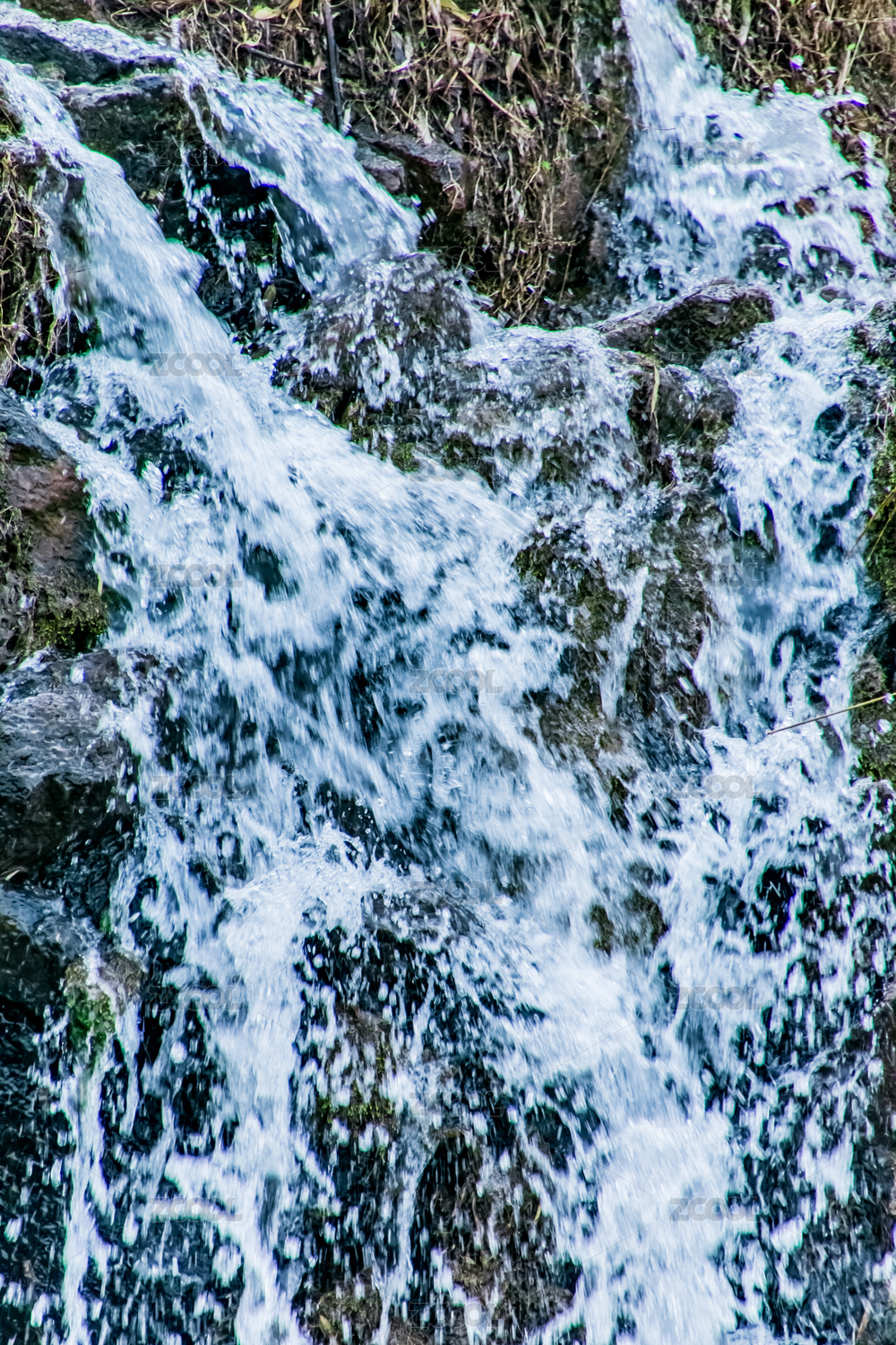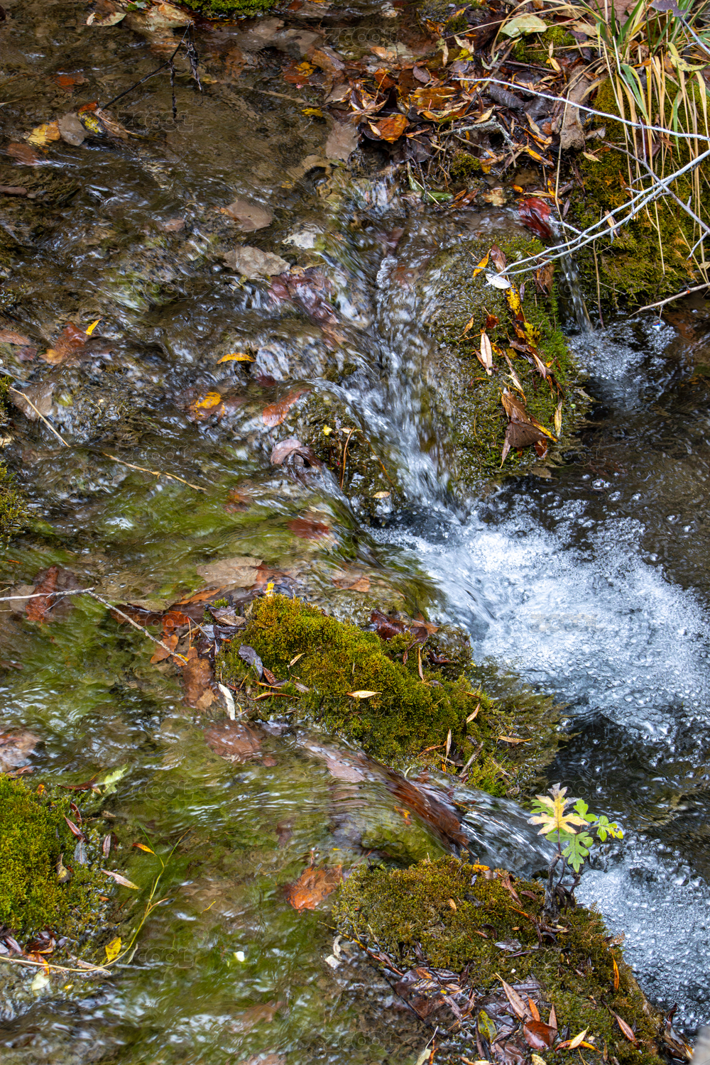 九寨沟珍珠滩溪流与苔藓覆盖的枯木