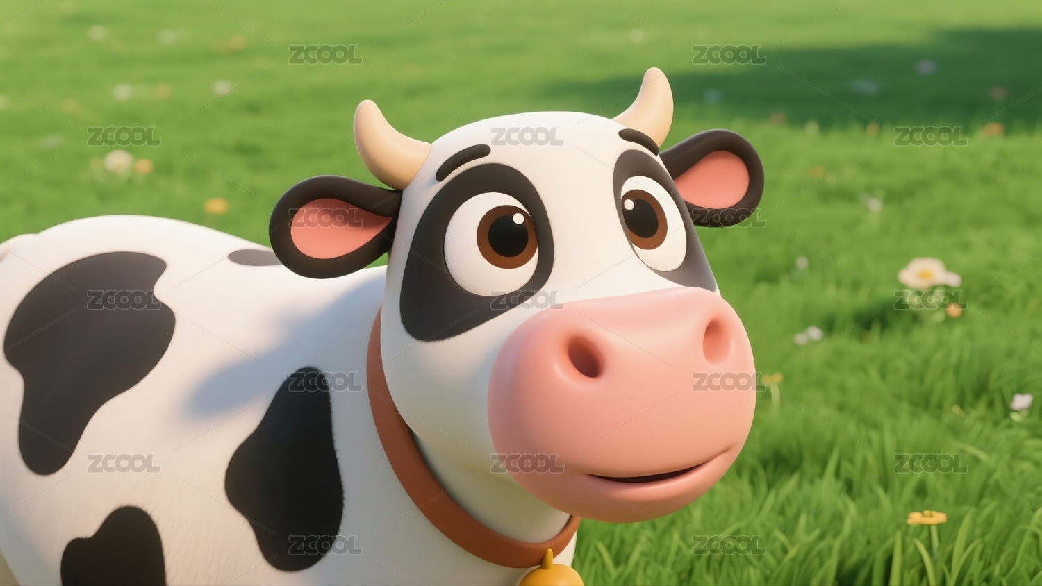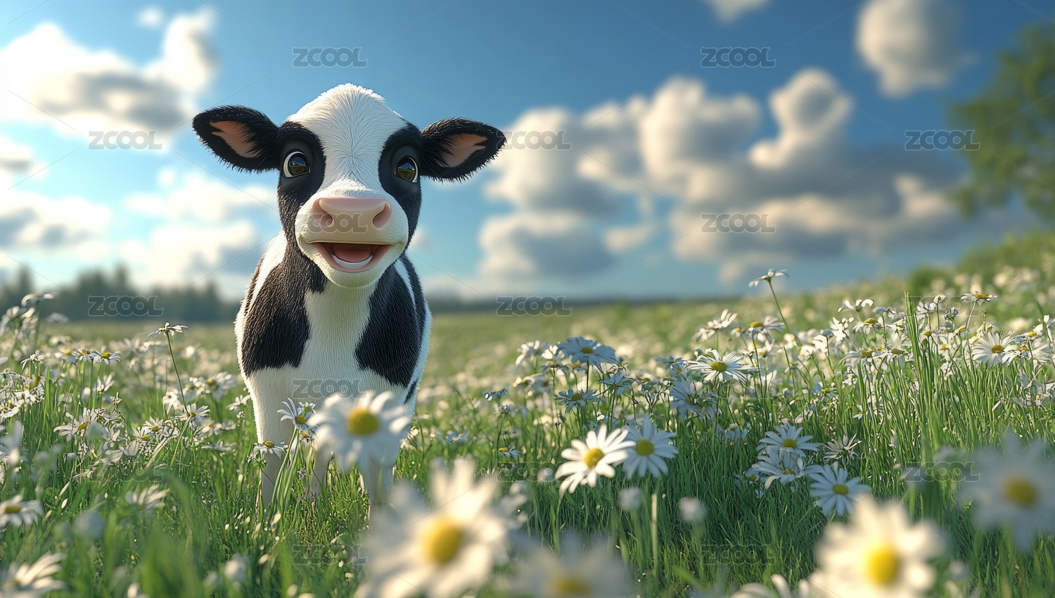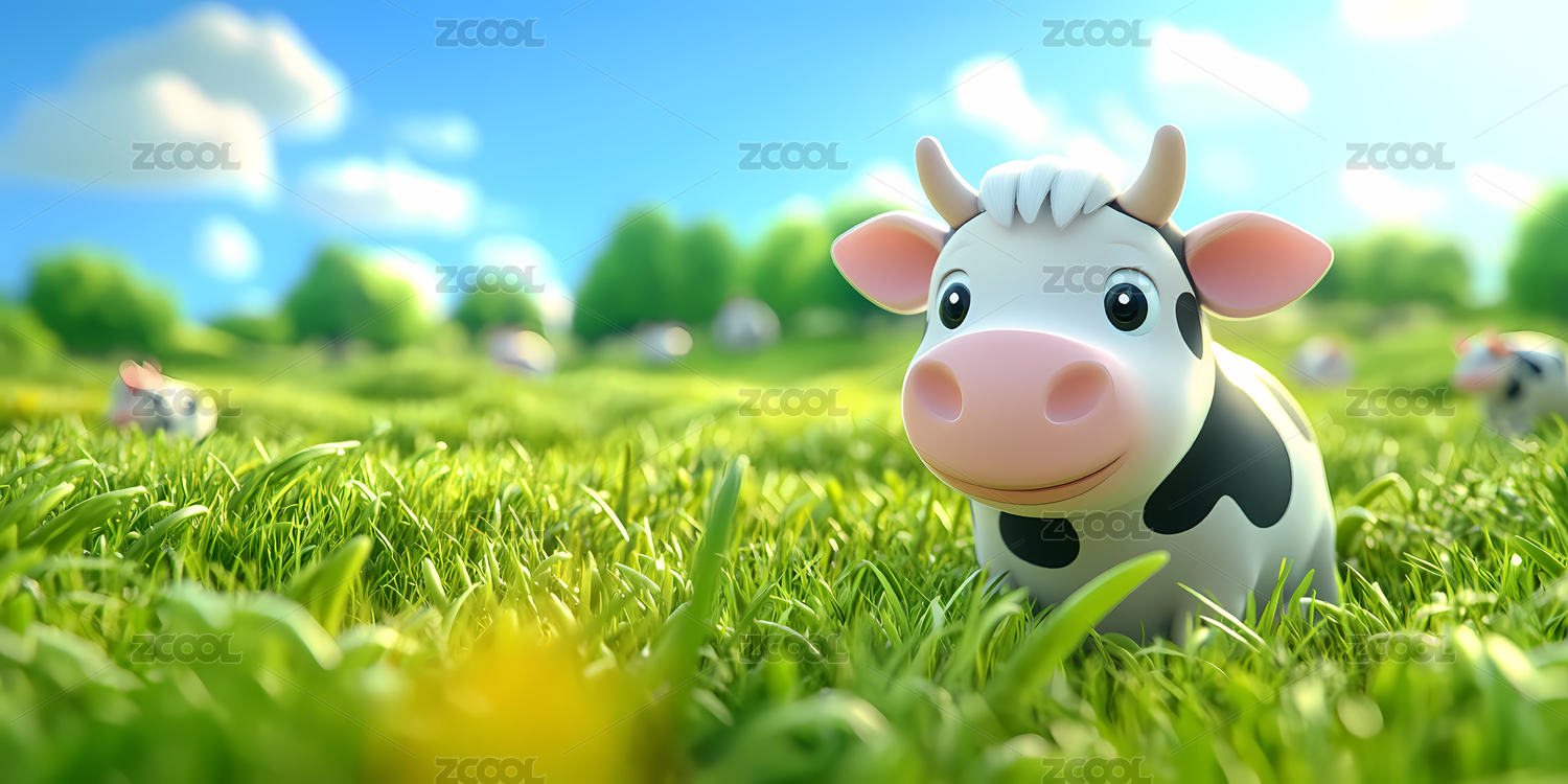 蓝天白云草地奶牛凝视前面前的一杯牛奶
