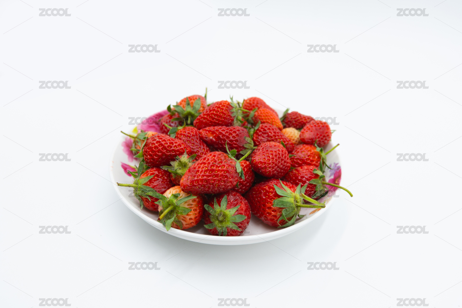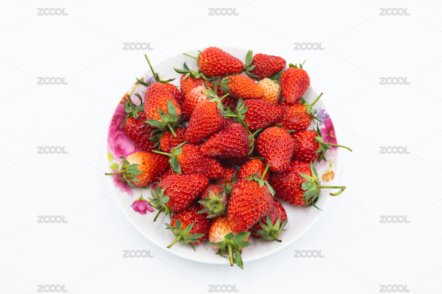 白色背景下用叶子形玻璃果盘盛着的刚采摘的新鲜草莓水果拼盘特写