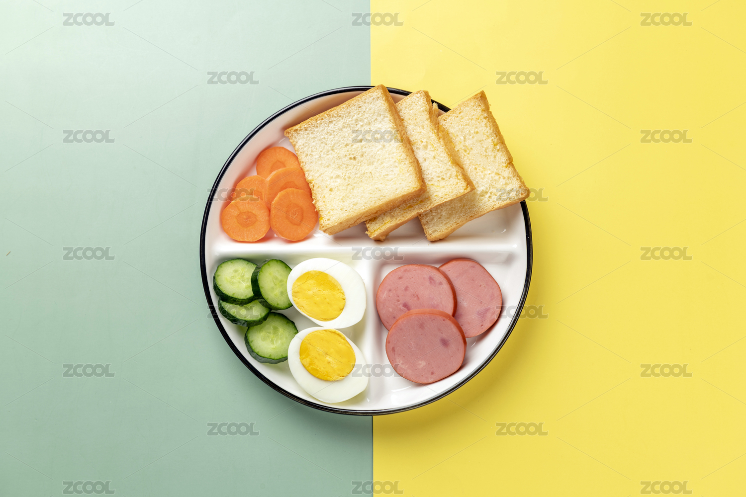 早餐特写牛奶面包煮蛋火腿蔬菜果汁白色背景