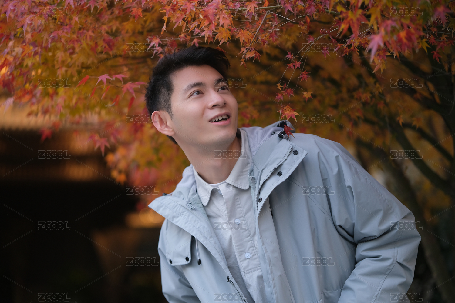 秋天的红色枫树下微笑高兴的年轻中国帅哥